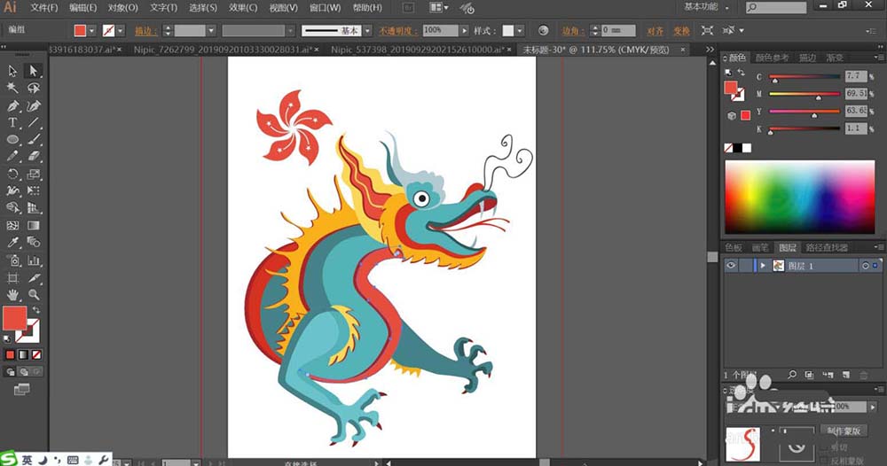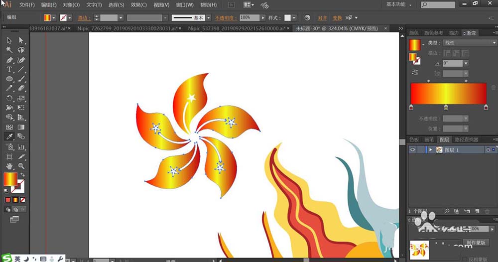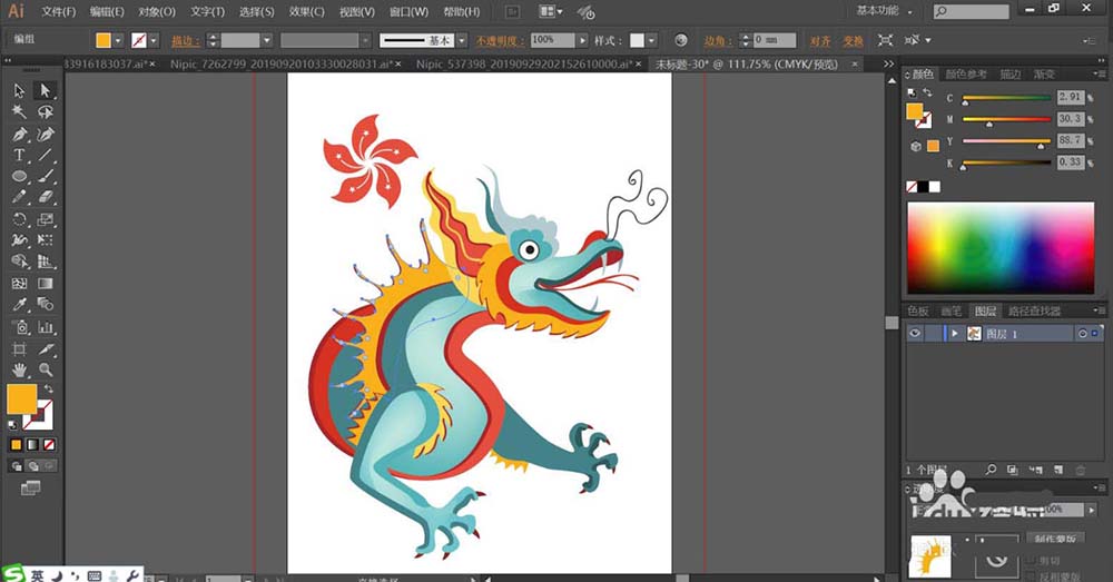 7、最后,我们设置橙色到黄色再到红色的渐变填充火花的路径,完成青龙图片设计。