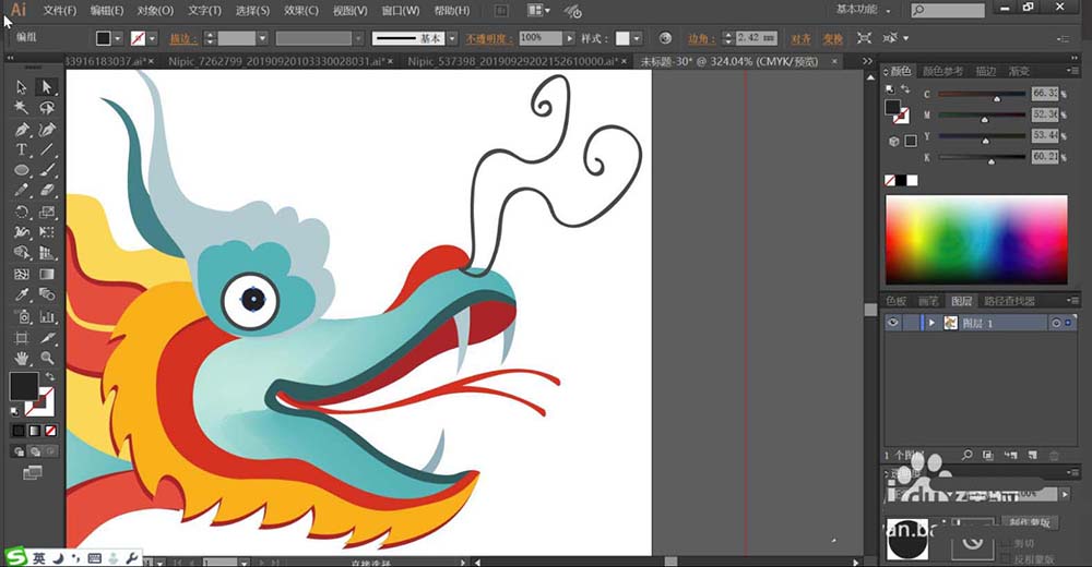 1、使用钢笔画出龙的表情与身体的细节路径,重点绘制龙头的眼晴与嘴巴,再用钢笔绘制龙的双脚与身体左侧的火花路径。