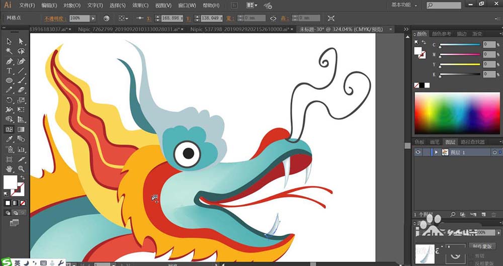 6、使用黑色填充龙的触须路径,再用网格工具点击龙的嘴巴高光区域与身体高光区域让其呈现渐变色的效果。