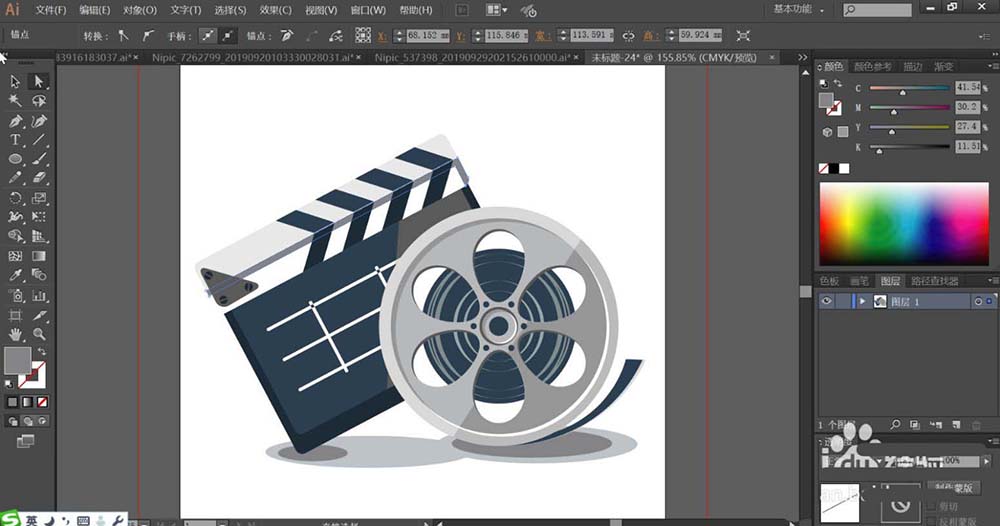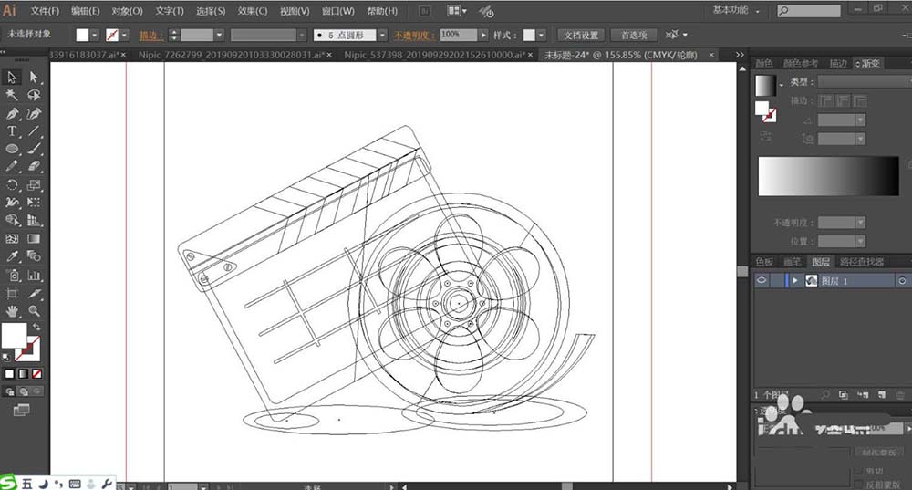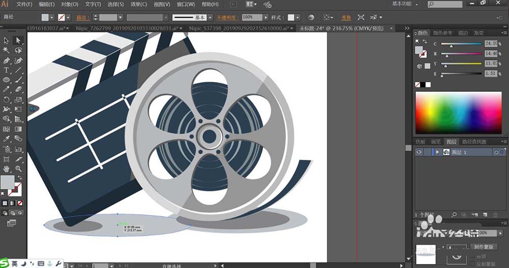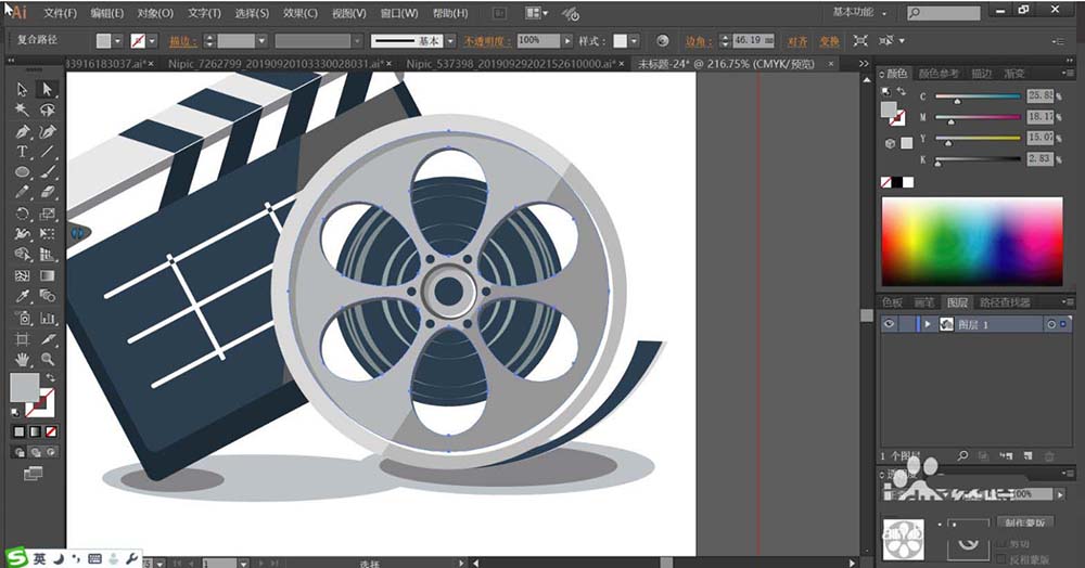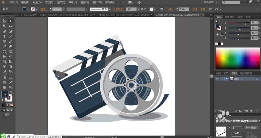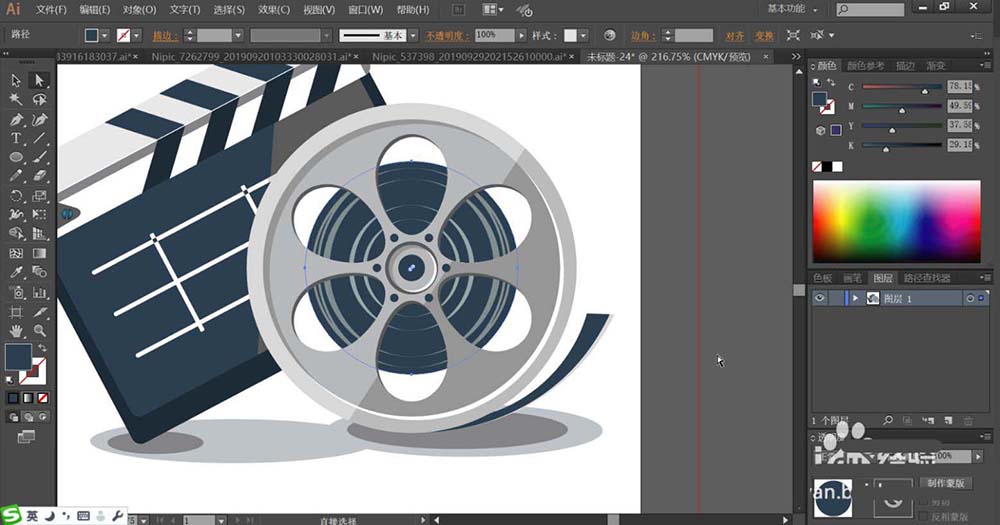 1、使用矩形工具画出场记板的基本轮廓,再用圆形画出放映机的圆孔,再用钢笔画出放映机的其它细节元素的路径。