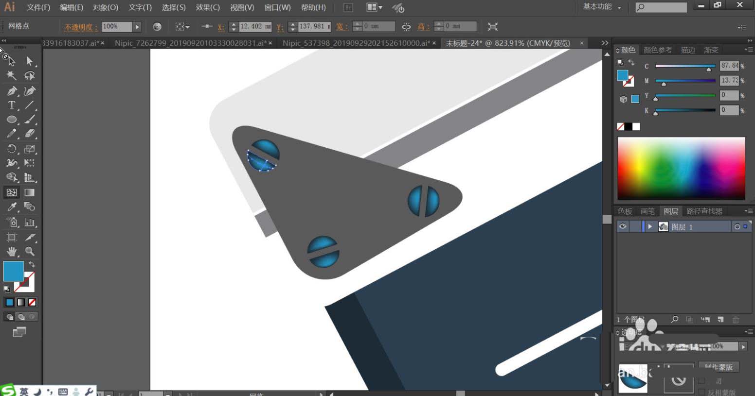 4、场记板左侧的三角板用蓝黑色与灰黑色搭配填充,再用网格工具点击一下三角板上面的铆钉让其呈现蓝色渐变的效果。
