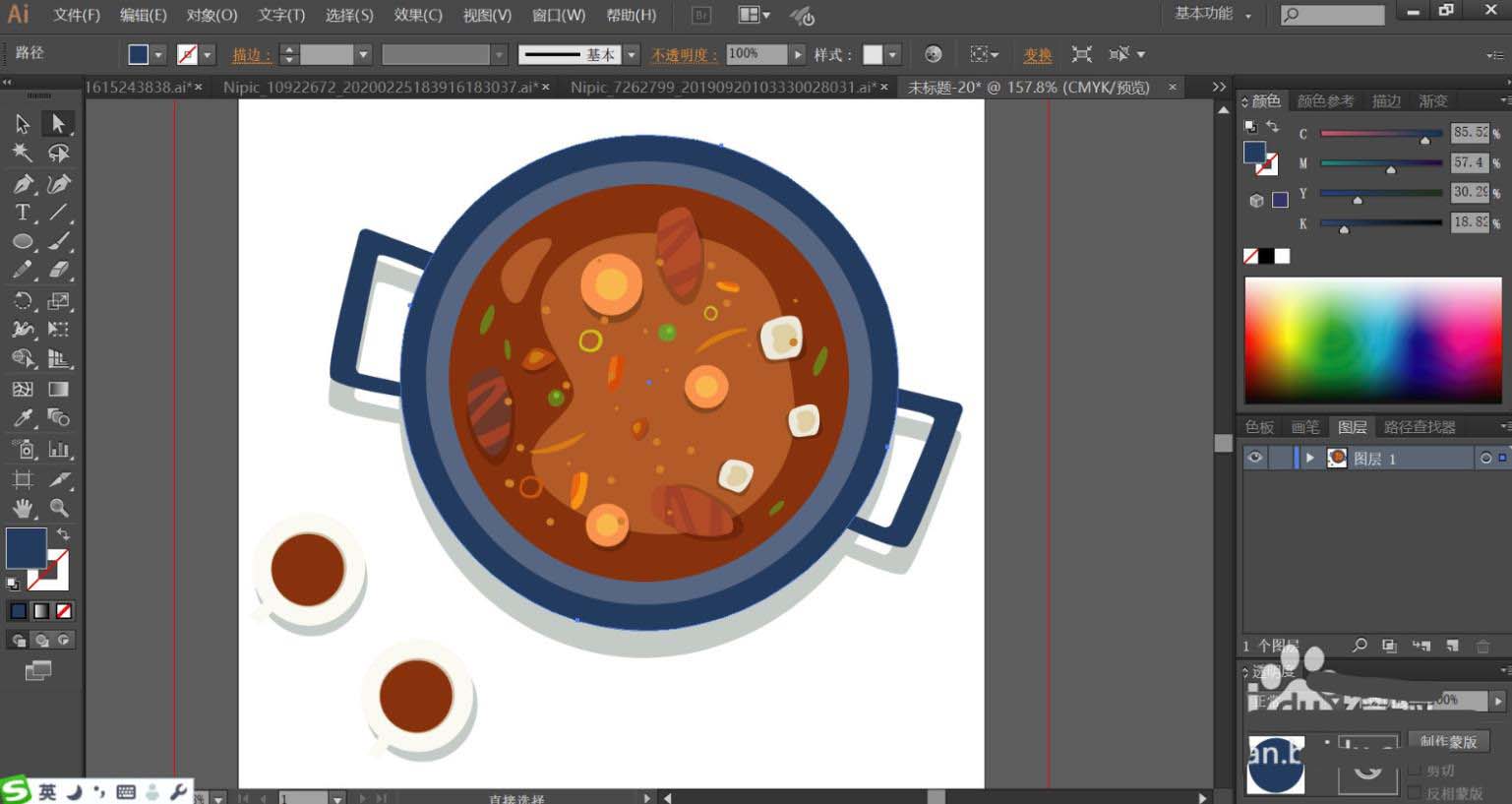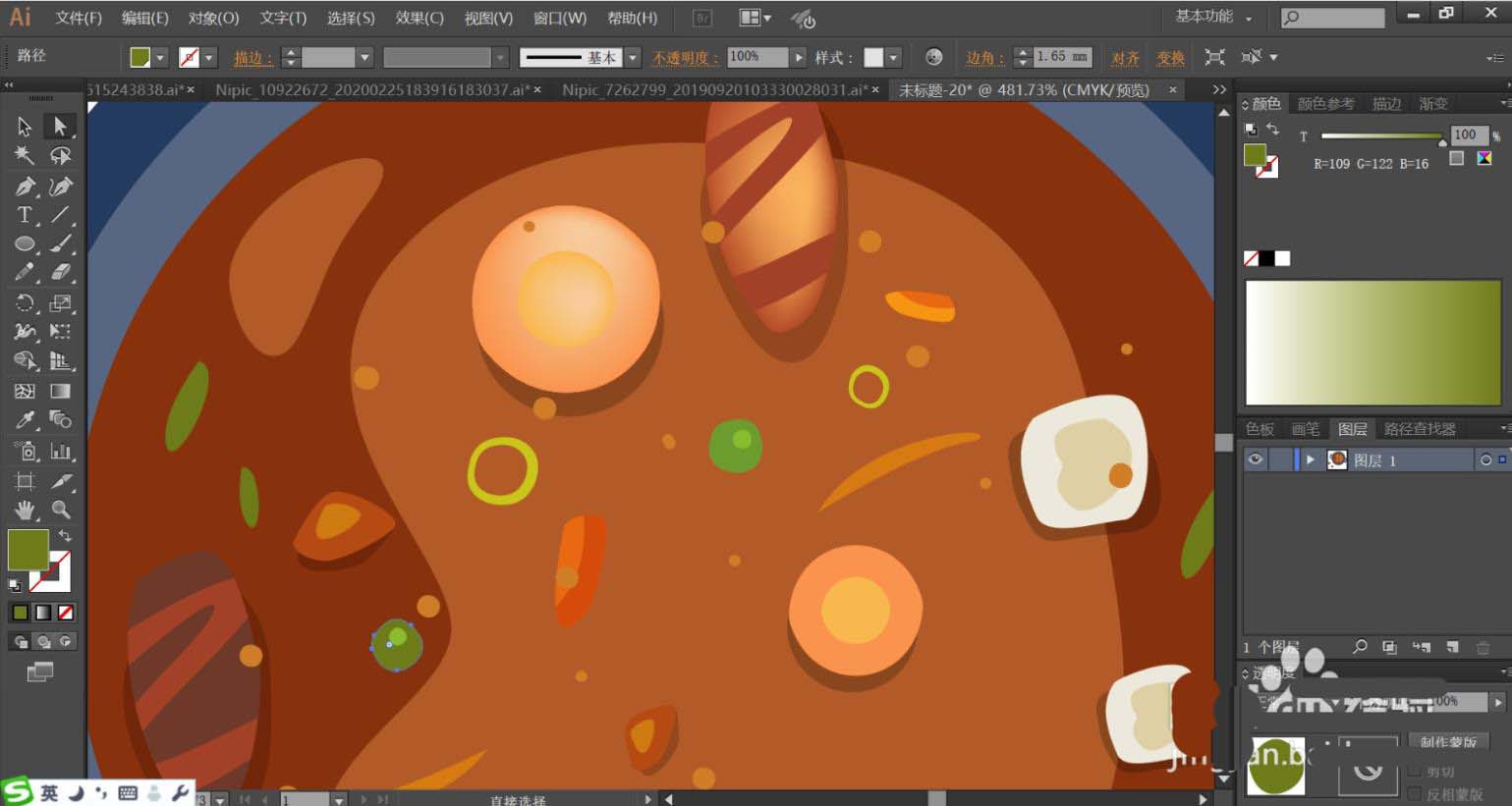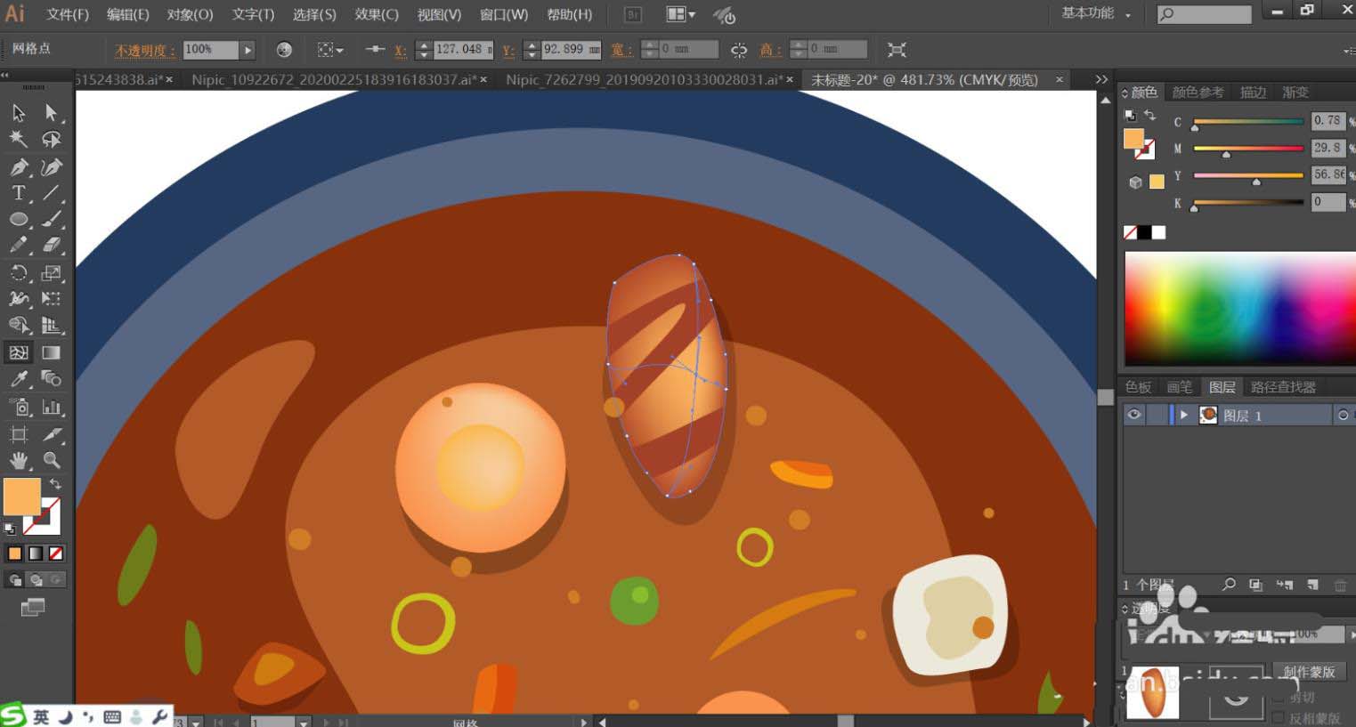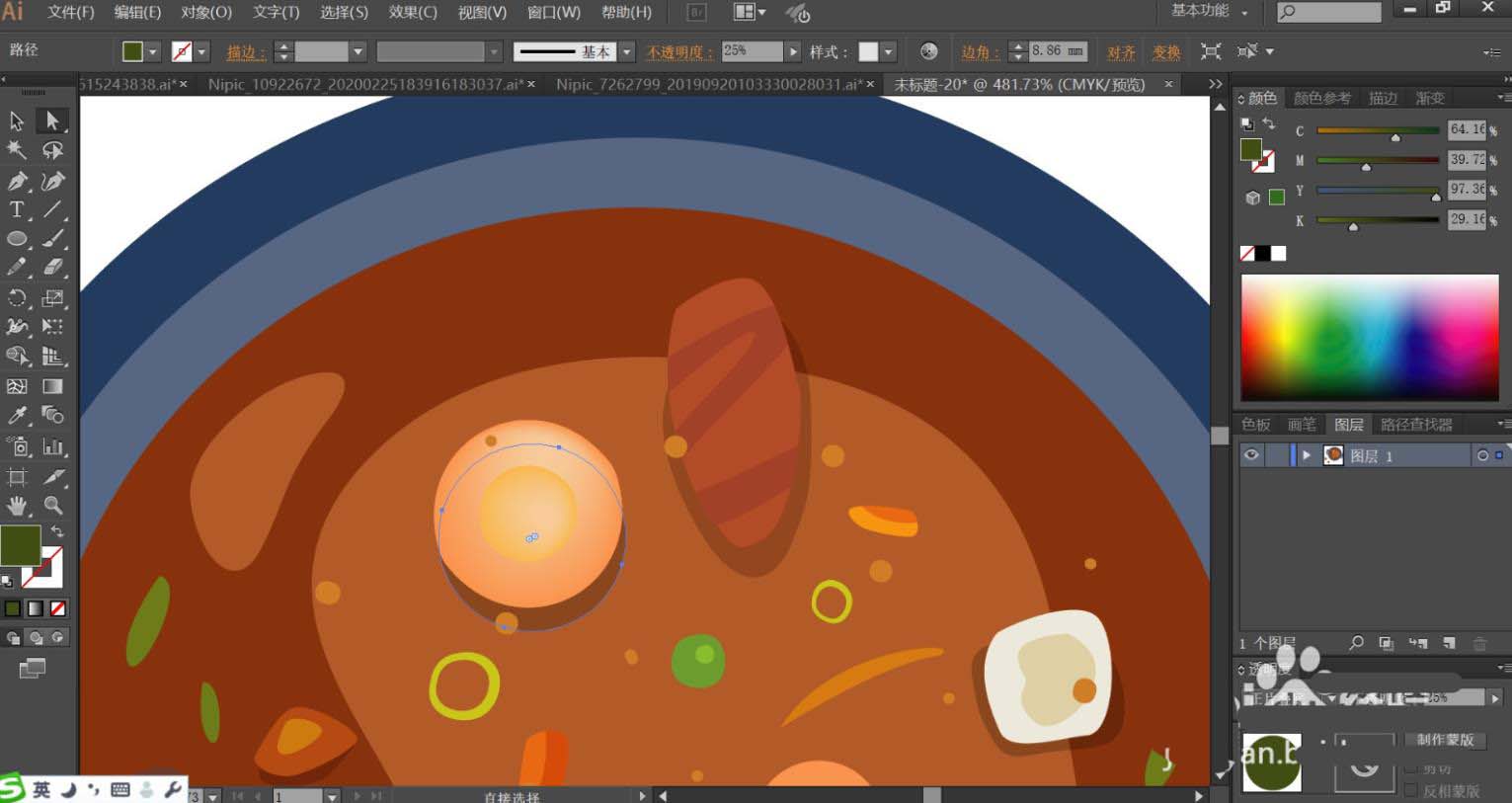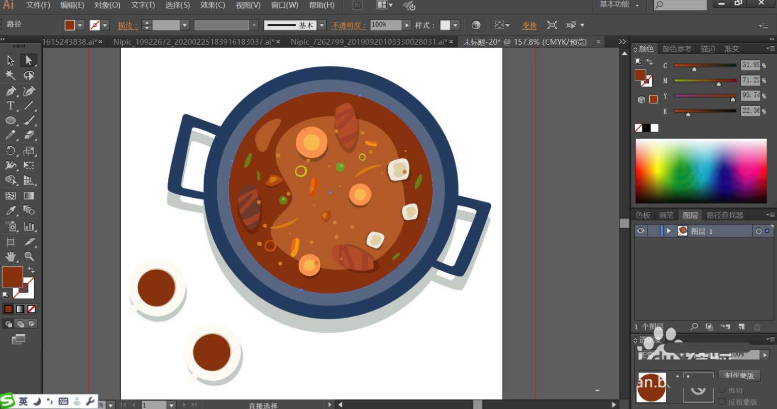 6、接着,我们用明暗红棕色填充汤里面的肉块主要与条纹,肉块的阴影用正片叠底的土灰色填充,透明度为40%左右。汤里面的菜叶用明暗不同的绿色与桔红色填充。