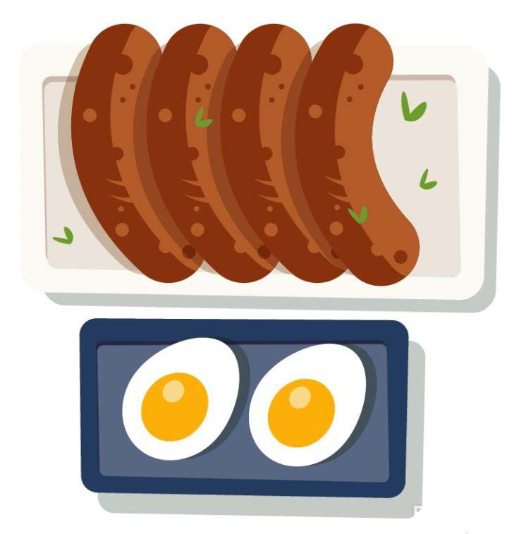 1、使用矩形工具画出餐盘的结构,一个大餐盘,一个小餐盘,再用圆形工具画出鸡蛋的细节路径,接着,我们用钢笔画出烤肠的细节路径。
