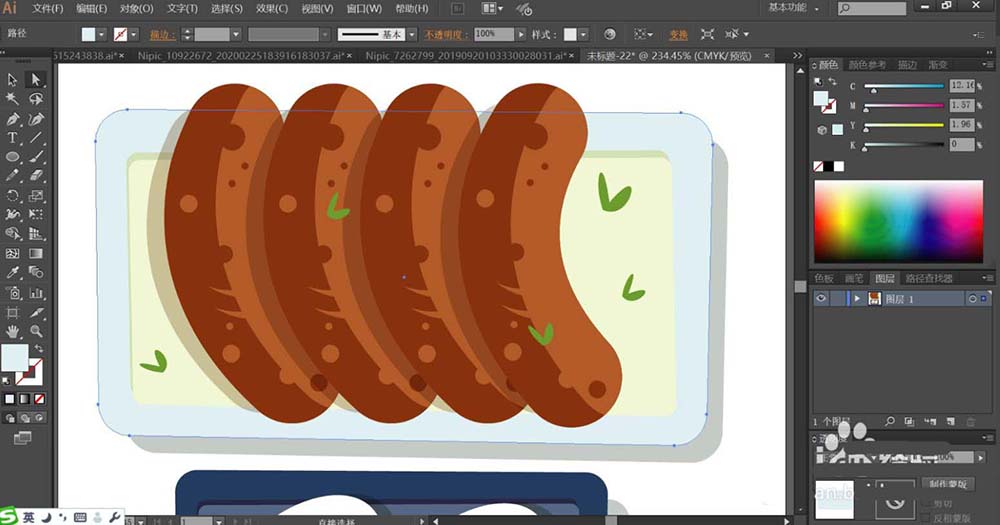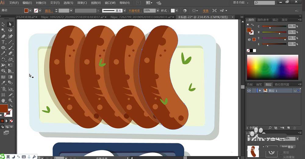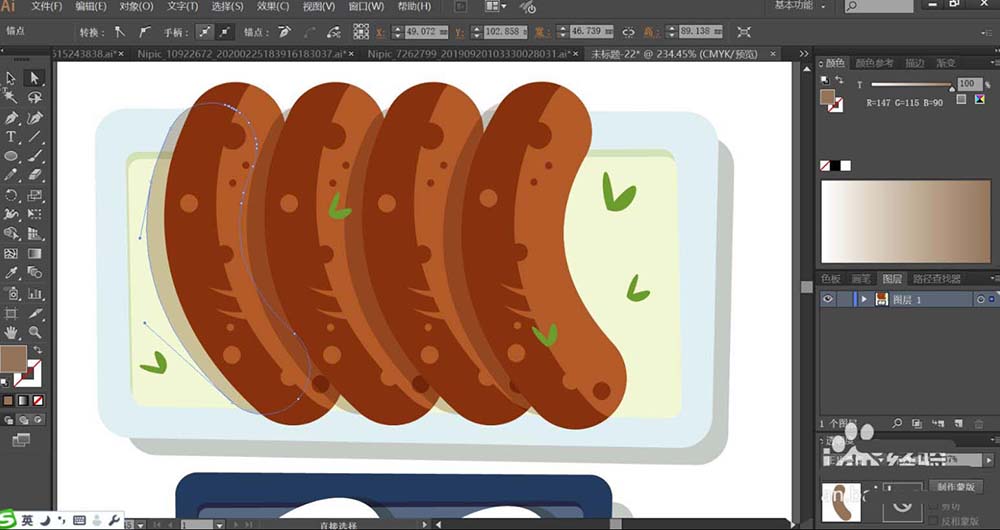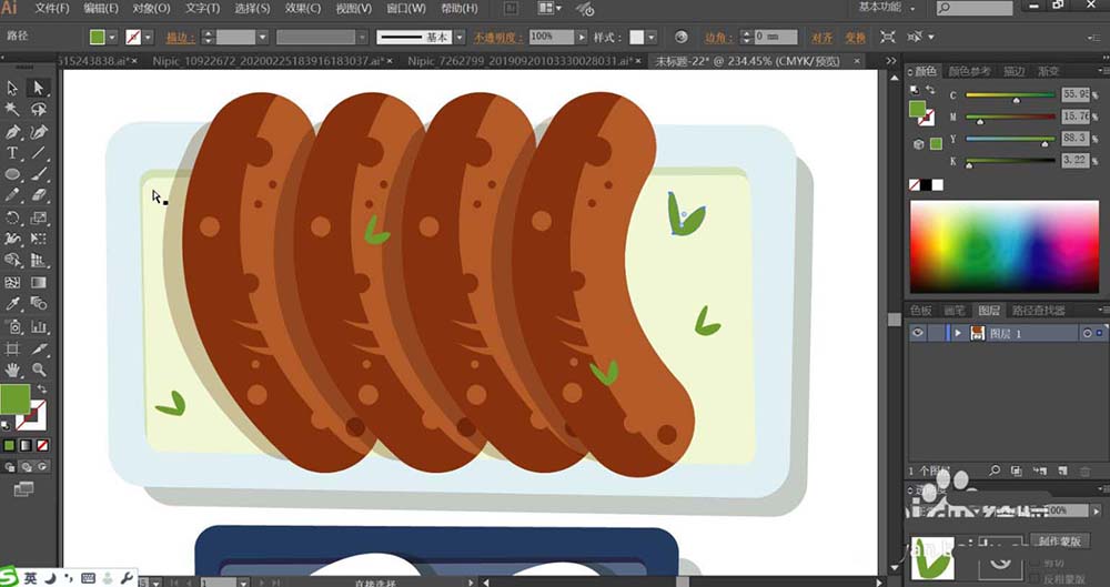 3、使用深绿色填充菜叶,再用红棕色与红褐色搭配填充烤肠的左侧与右侧路径。