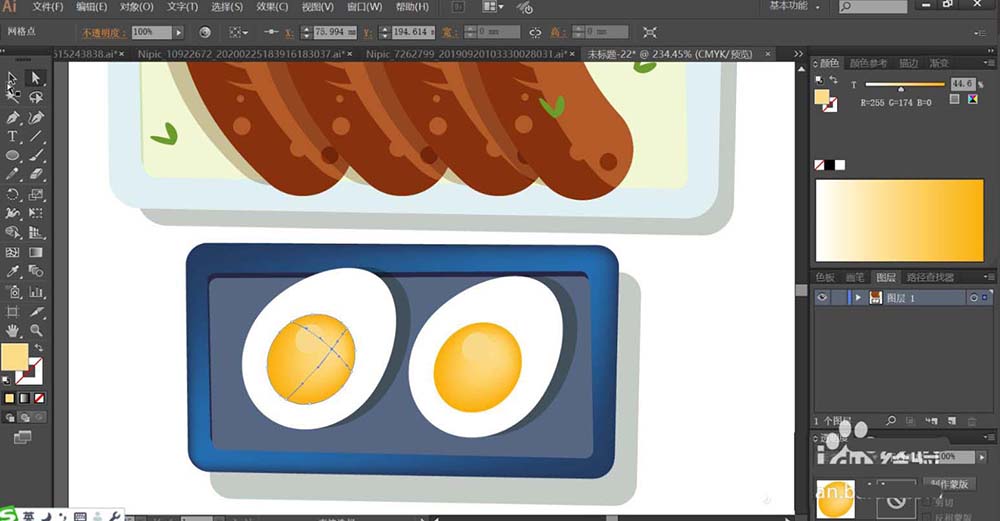 7、使用白色填充鸡蛋的边缘,再用橙色与黄色搭配填充鸡蛋的蛋黄路径,使用网格工具点击一下鸡蛋的蛋黄让其呈现渐变色的效果,完成烤肠鸡蛋图片设计。