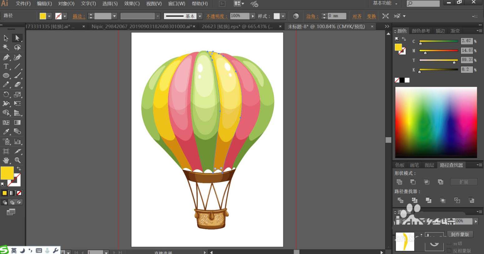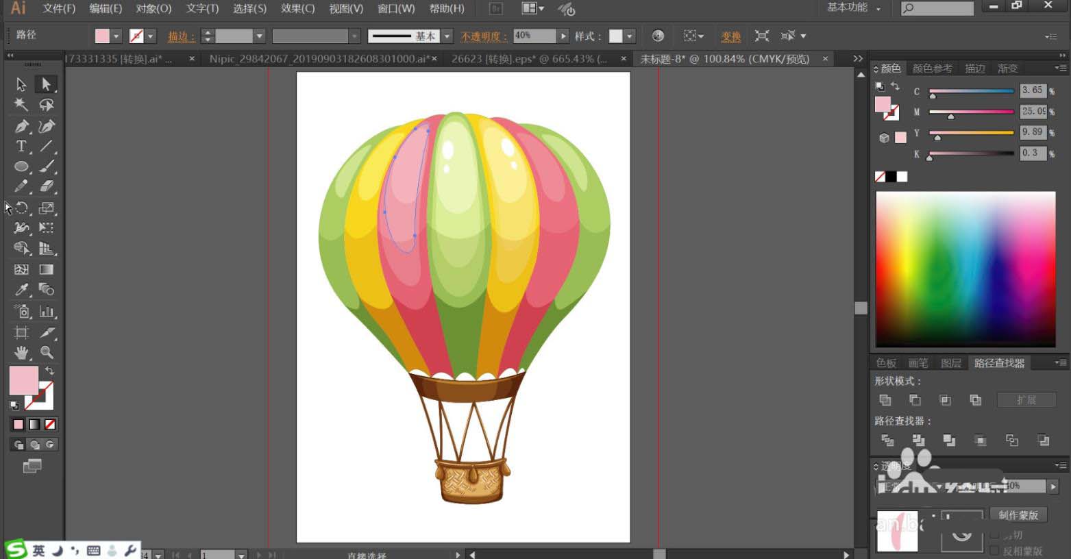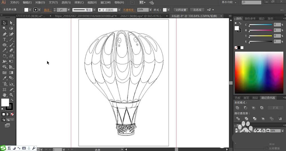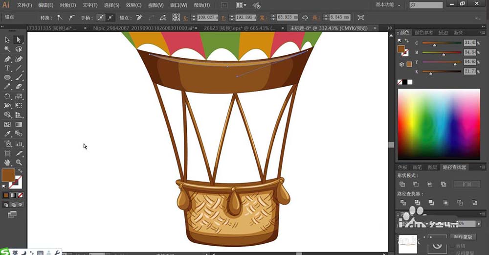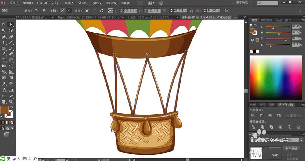 1、使用钢笔画出热气球上方的不同的色块的路径,再用圆形描绘各个不同的亮光路径,使用钢笔画出热气球下方的吊绳与吊篮的基本轮廓路径。