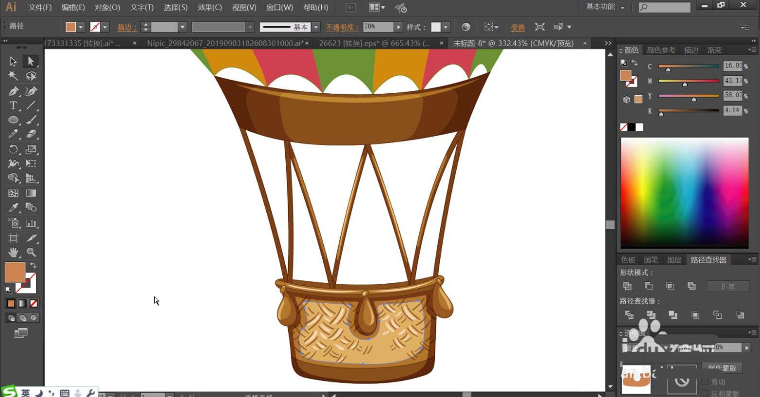 7、使用黄棕色填充吊篮下方的主体路径,再用正片叠底的黄棕色填充吊篮的下边缘暗光路径,表面的高光用透明度为70%的土黄色填充,设置色彩模式为滤色,完成热气球图片设计。