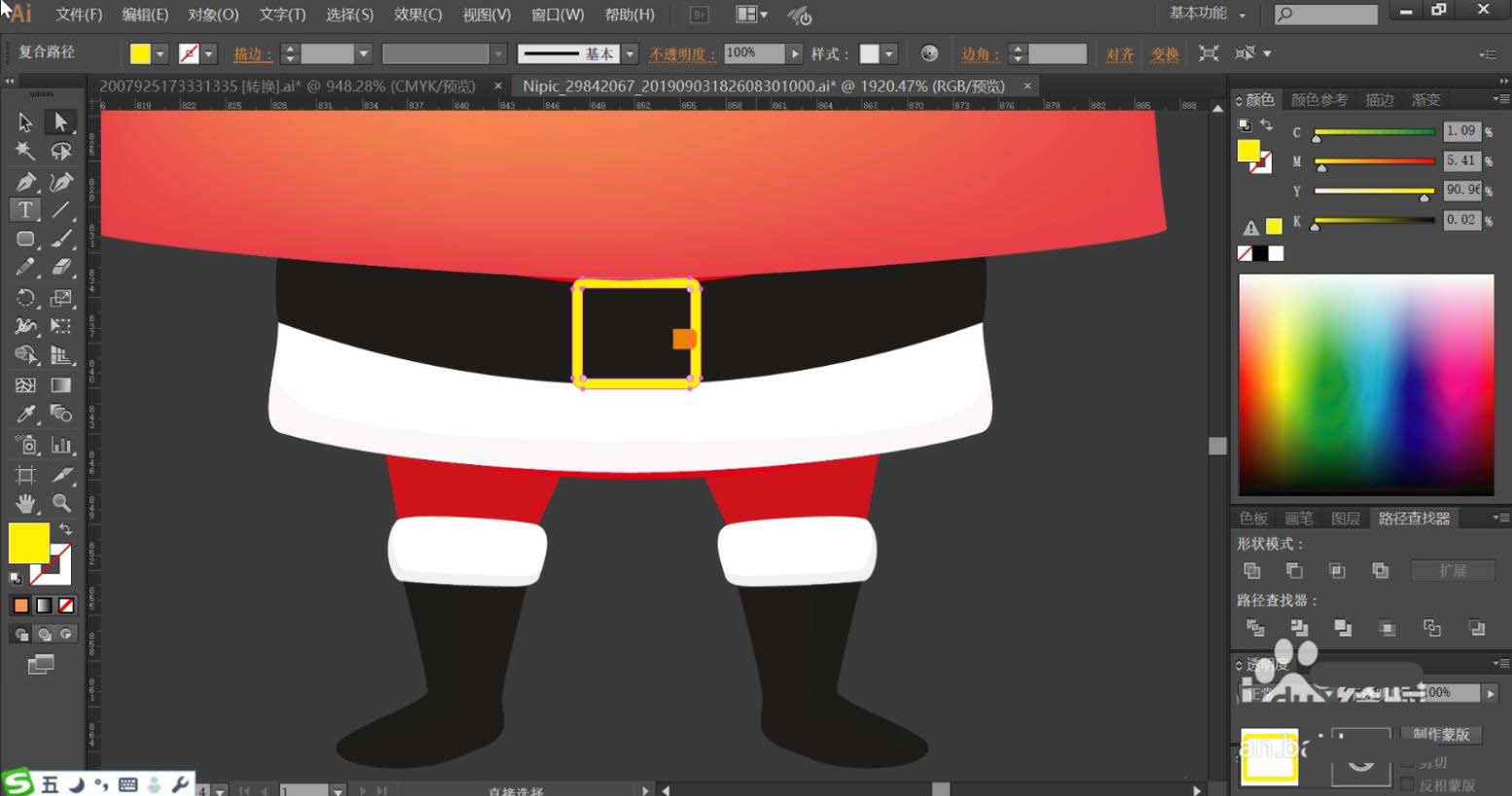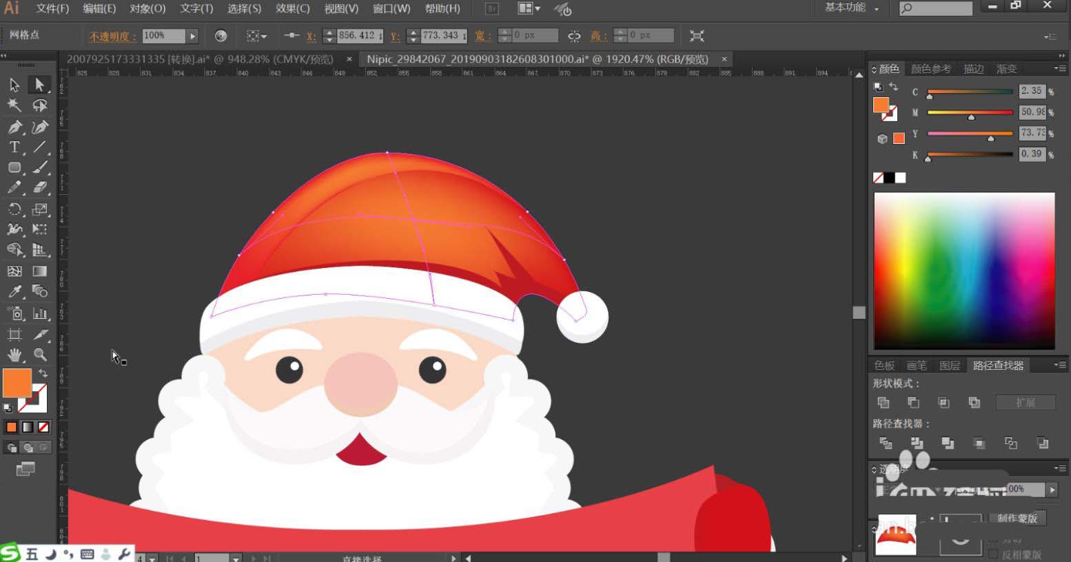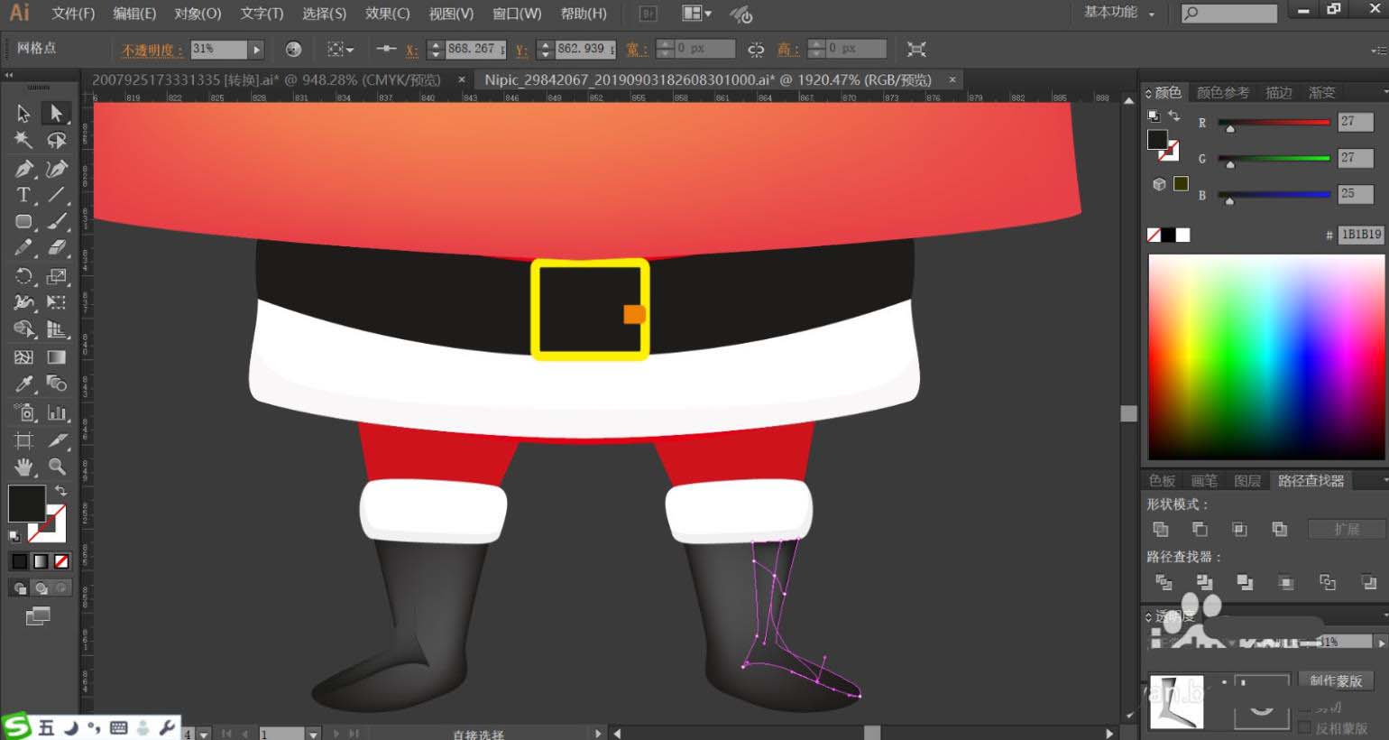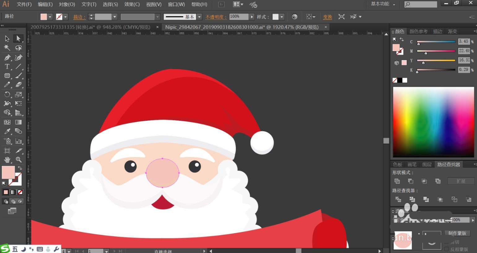 1、使用钢笔画出圣诞老人的帽子与脸蛋的路径,再画出老人的鼻子、眼晴与胡子的细节元素包括边缘暗光路径,接着,我们画出老人手里的报纸路径,继续画出老人的衣服与皮带、裤子、鞋子的路径。