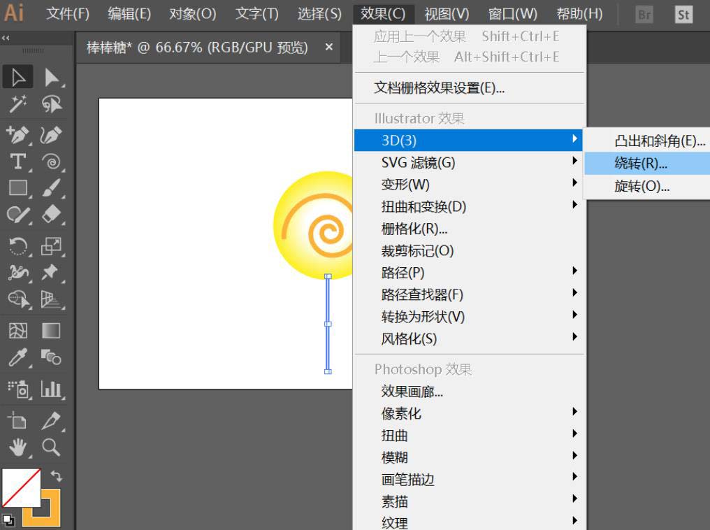 6、选中该矩形,依次点击“效果”-“3D”-“绕转”,获得一个圆柱体充当棒棒糖的糖棒,这样一个棒棒糖图案就画好了!