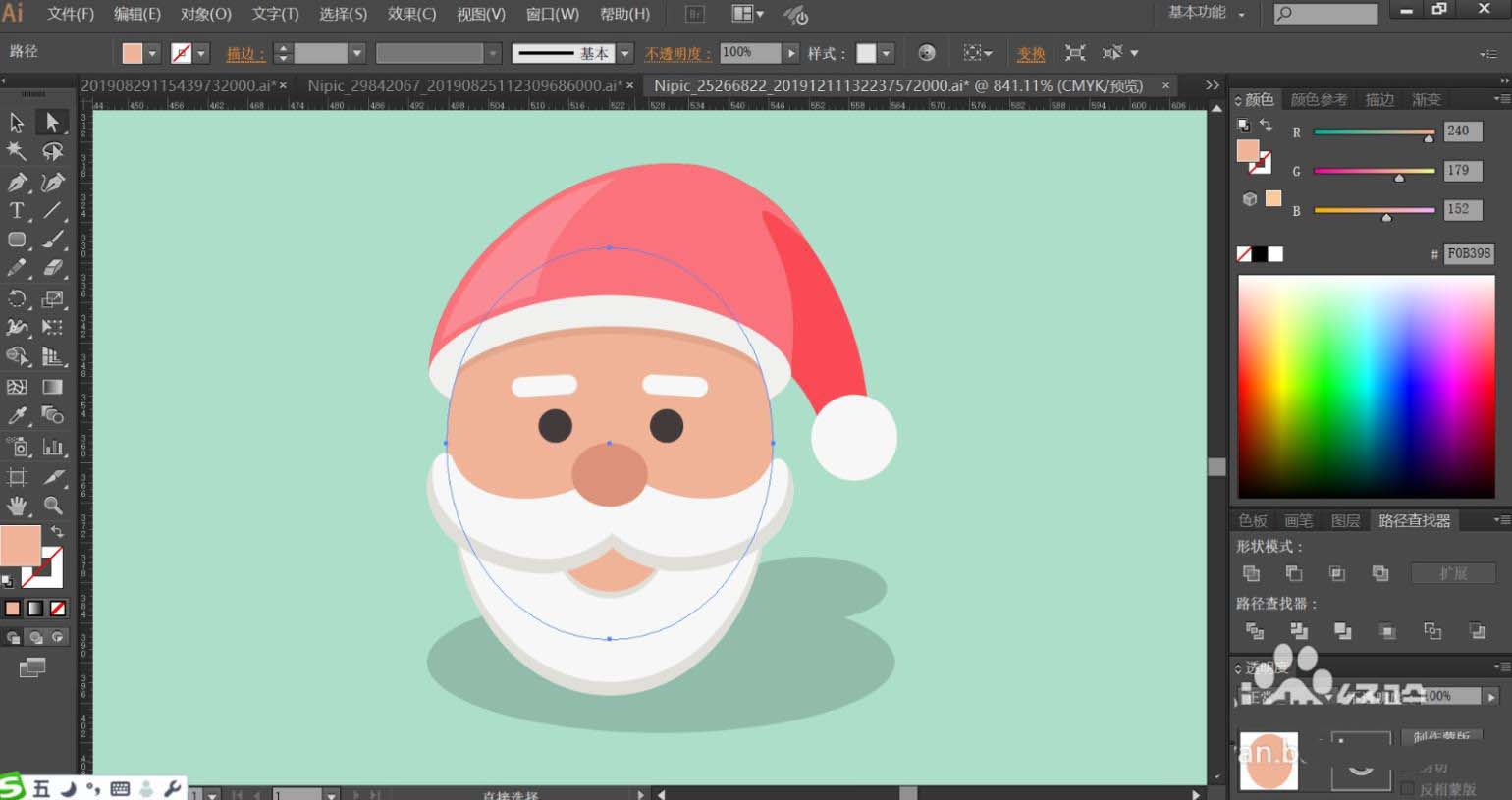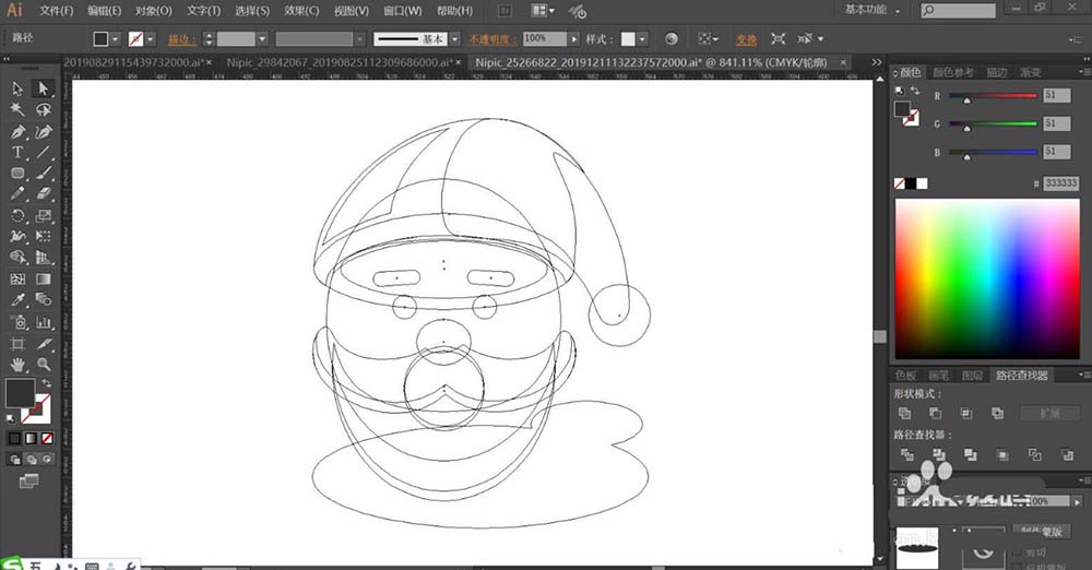 4、接着,我们用钢笔画出圣诞老人头像的基本轮廓,再画出他的表情与周边元素的路径,重点绘制出帽子、胡子、阴影等路径。