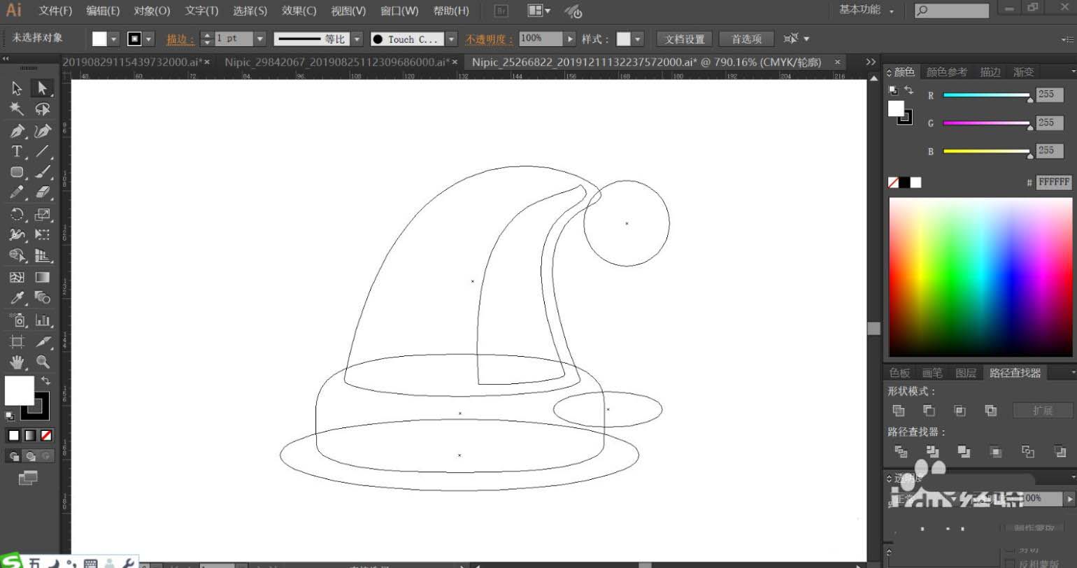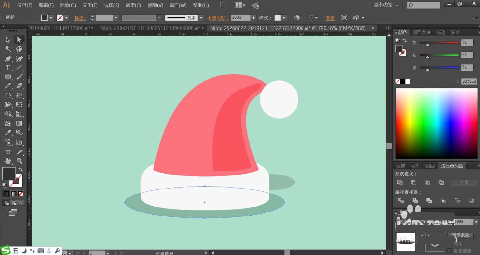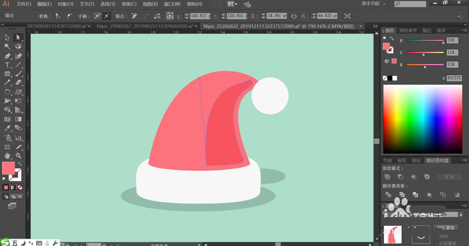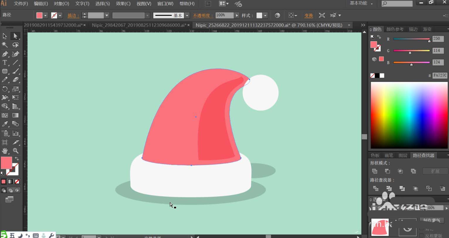 1、使用钢笔工具绘制出圣诞帽的基本轮廓,再用把圣诞帽的暗光路径与阴影路径一一绘制出来。