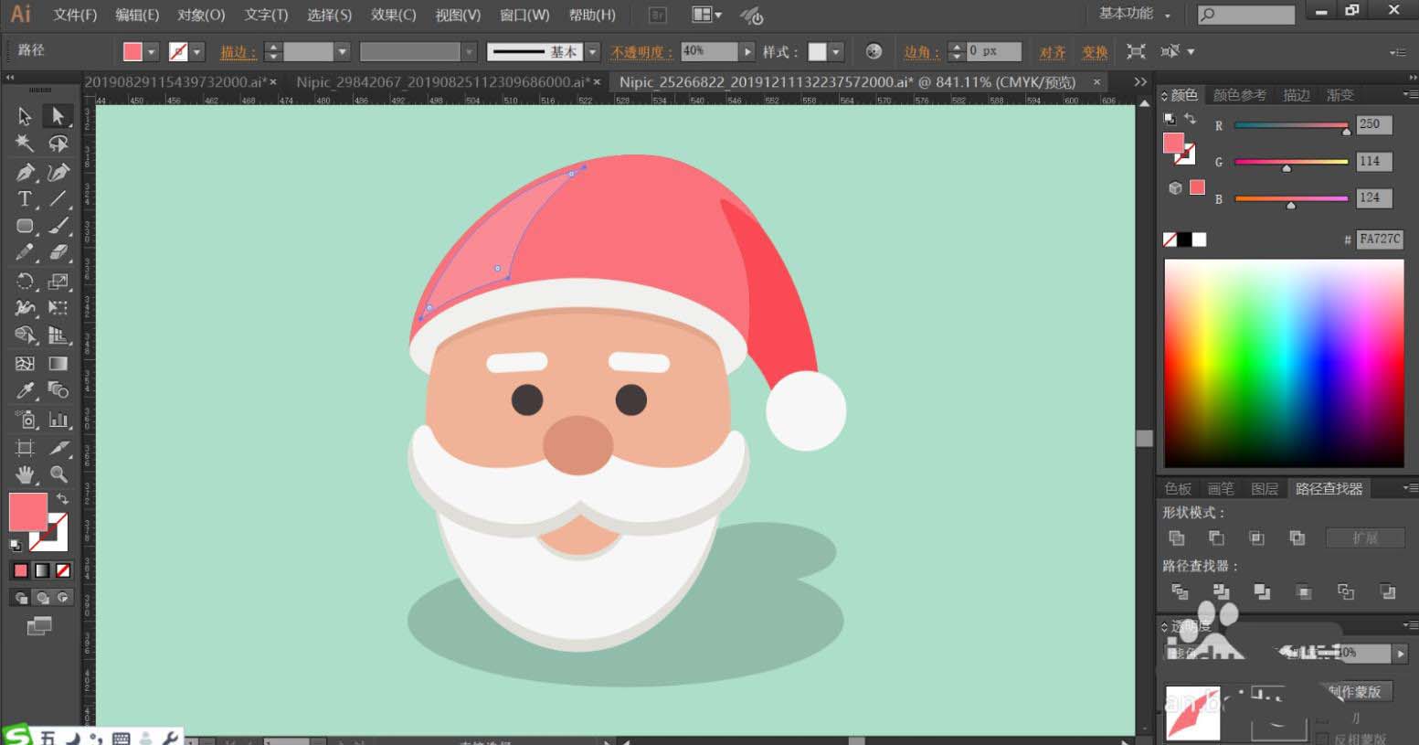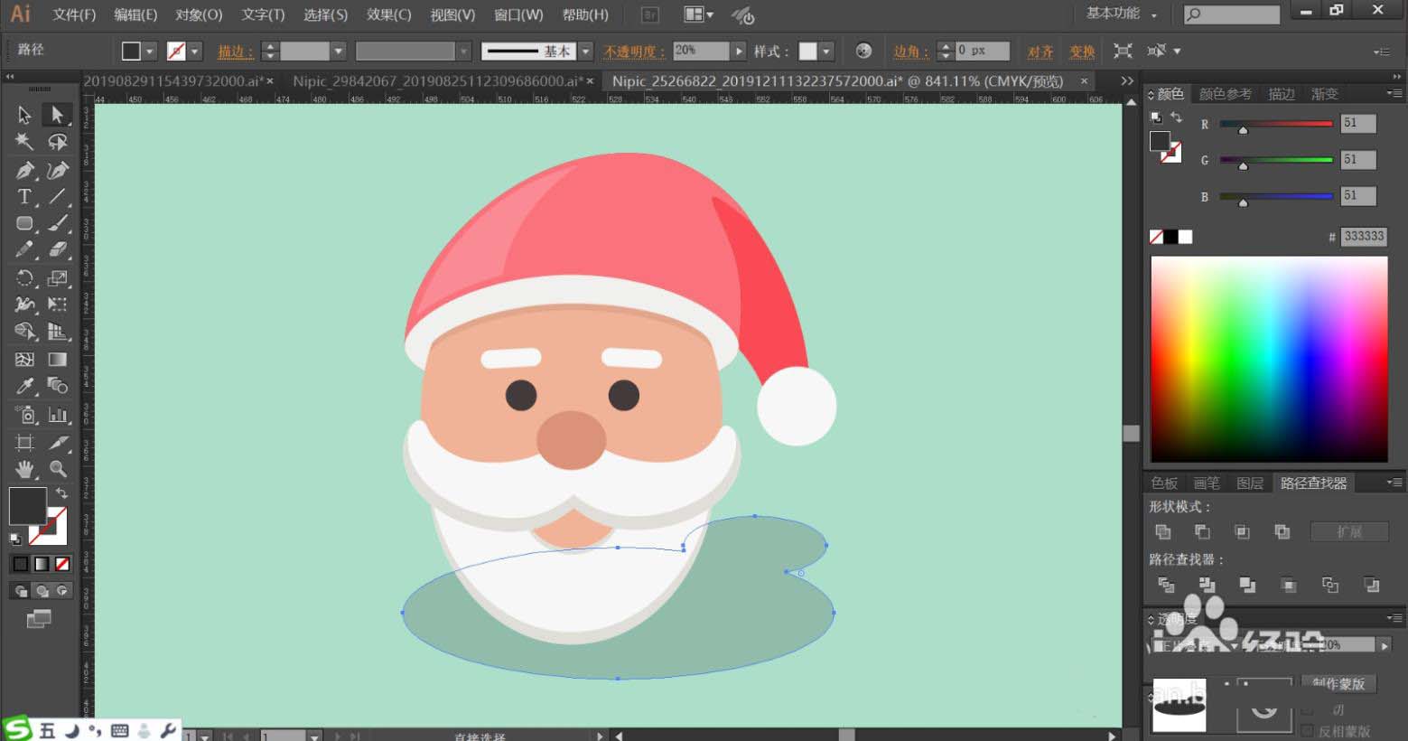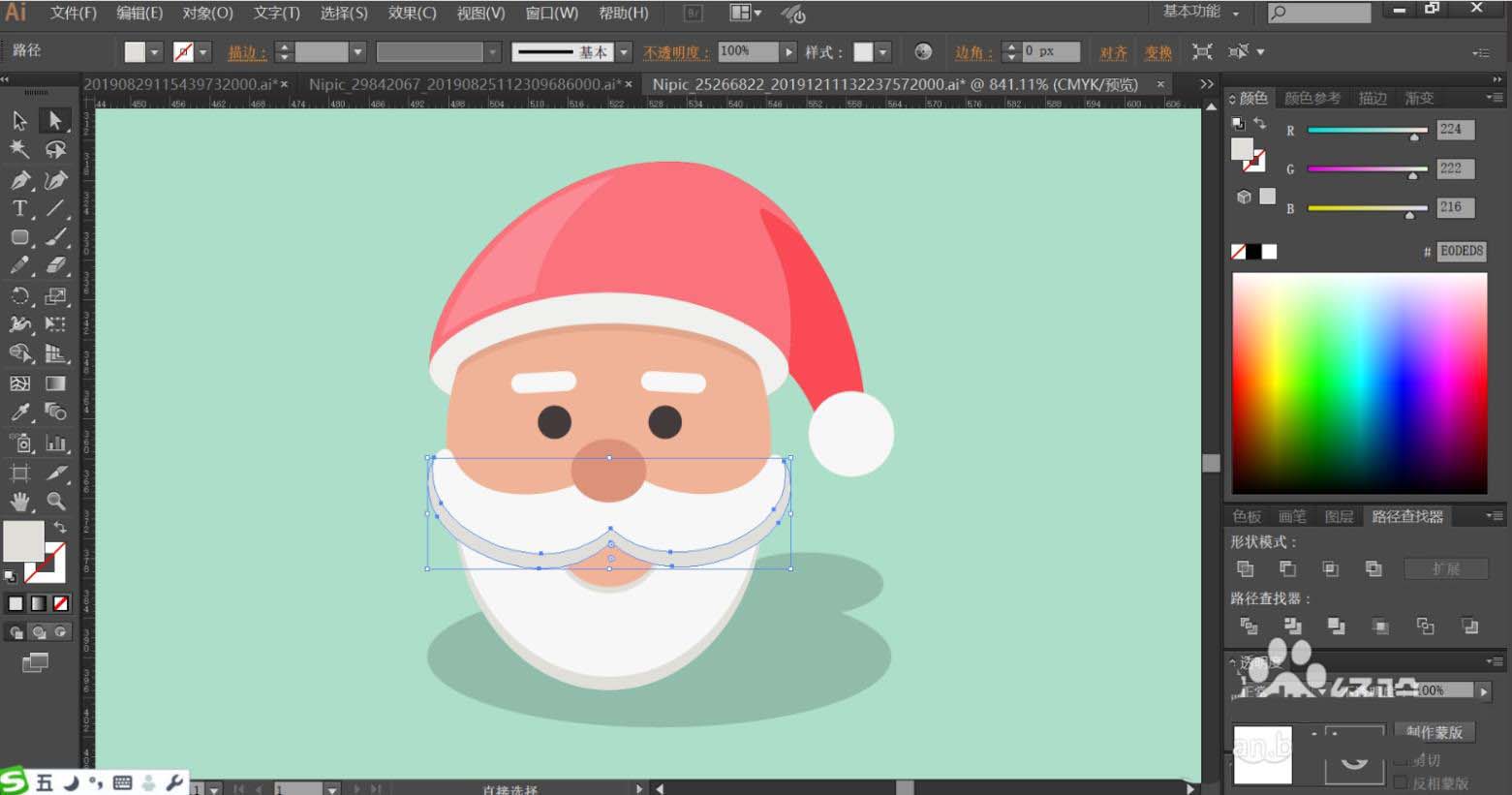 7、最后,我们用灰白色填充胡子与嘴巴的暗光路径,再用半透明的灰黑色填充圣诞老人的头像的阴影,设置阴影为正片叠底模式,完成圣诞老人头像设计。