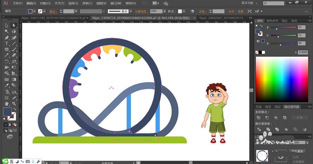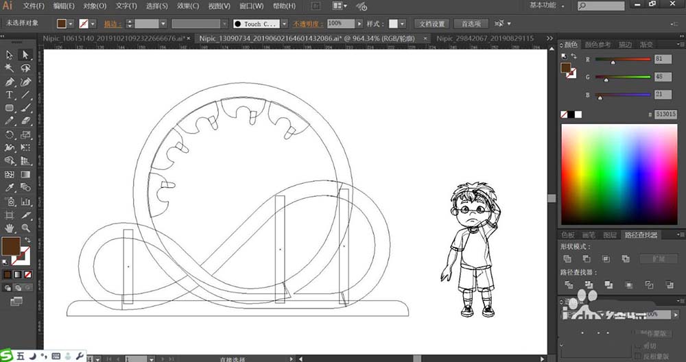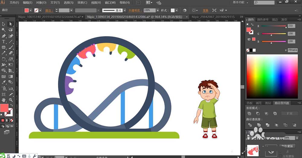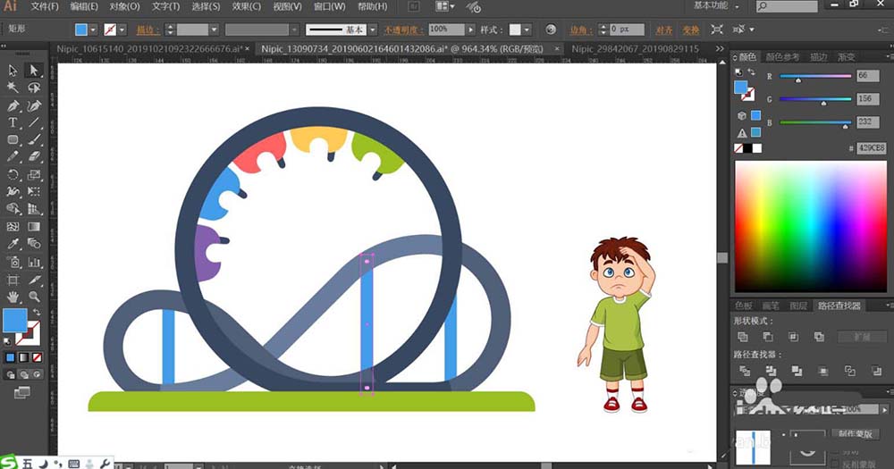 1、使用钢笔绘制出过山车的基本轮廓,再用钢笔勾勒出过山车上面的座椅,右侧的小孩子的动作与表情的细节路径。