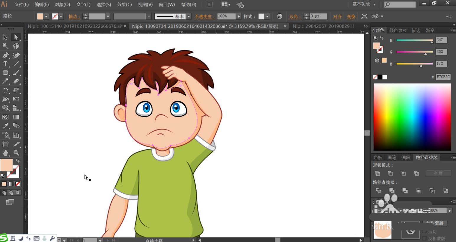 5、小孩的头发用红棕色填充,脸蛋我们填充为浅粉色,头发下方的暗光用暗浅粉色填充。