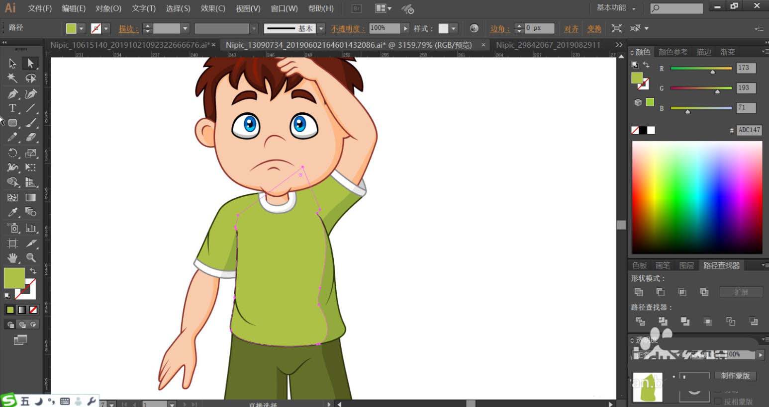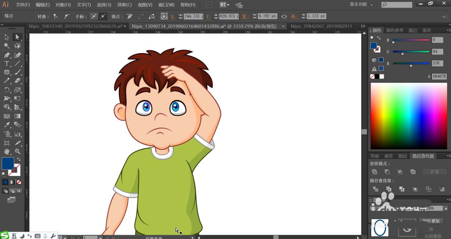 6、小孩的眼晴用蓝色与浅蓝色搭配白色填充,眉毛用红棕色填充。手臂用粉色填充,衣服的领口与袖子做出白边的效果。