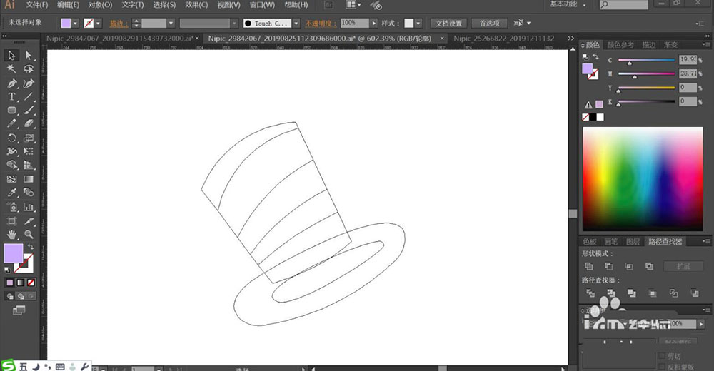 1、使用钢笔画出魔术帽的基本轮廓,再用圆形画出魔术帽的下方暗光圆形,魔术帽上面的条纹也用钢笔一一绘制出来。