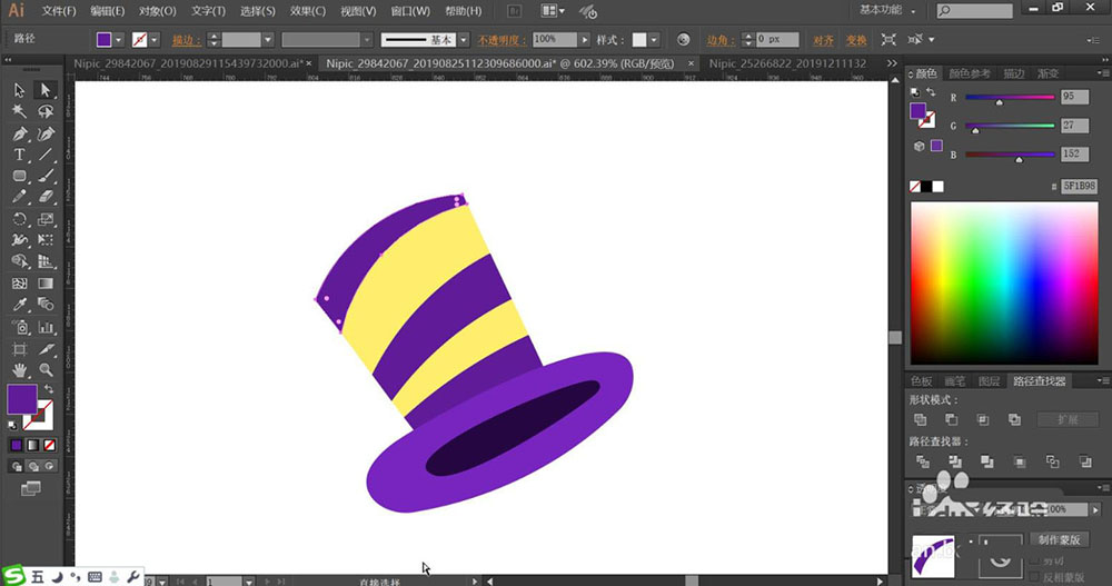2、使用紫色填充帽子的主体,再用暗紫色填充魔术帽的下方圆形暗光区域。