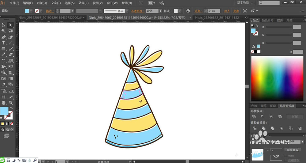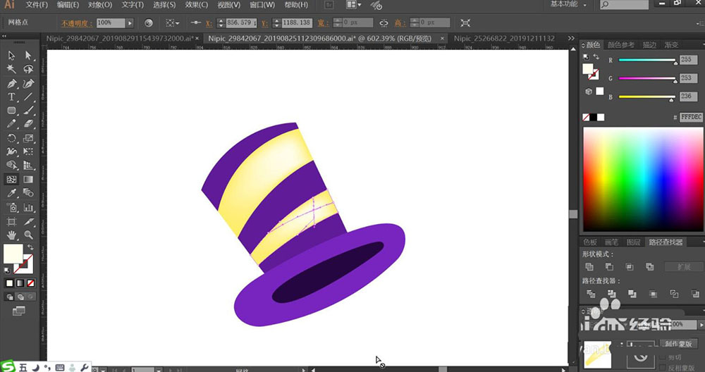 3、使用黄色填充魔术帽上面的条纹,再用网格工具点击一下条纹让其呈现黄色的渐变效果。