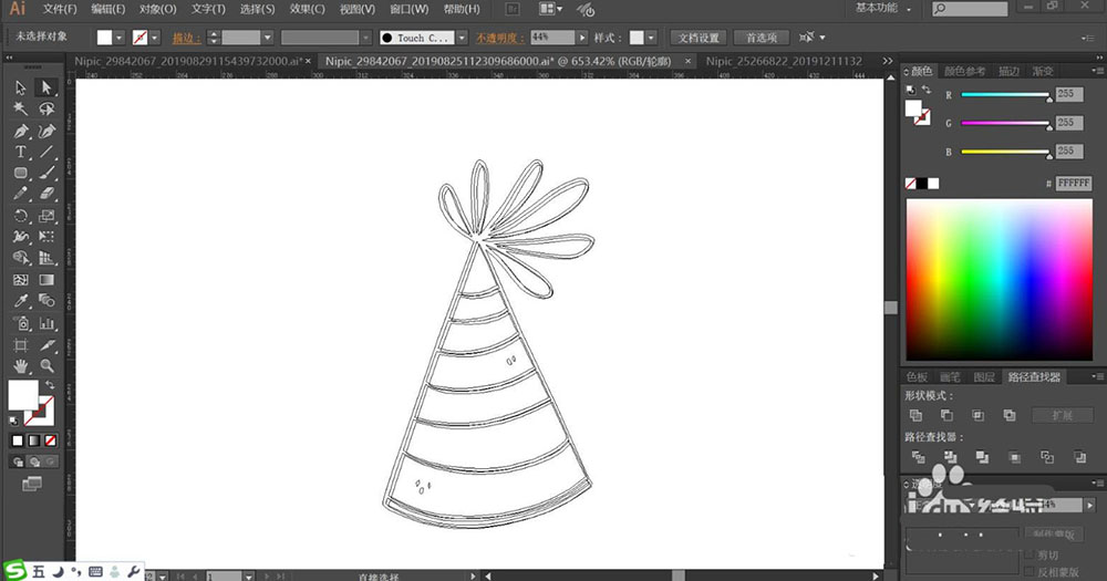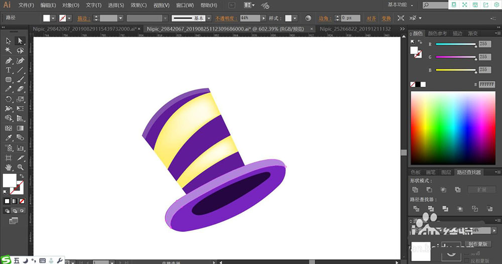 7、最后,我们用钢笔画出礼帽的左侧与右侧的亮光与暗光路径,使用半透明的白色填充左侧,使用半透明的黑色填充右侧,完成礼帽图片设计。