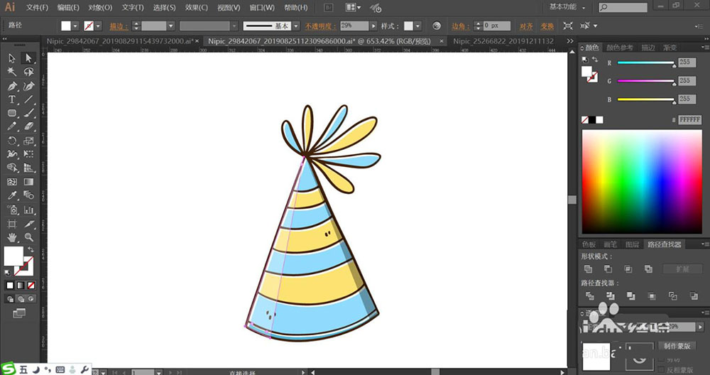 4、使用钢笔绘制出魔术帽上面的亮光路径与下方的亮光路径,使用半透明的白色填充亮光路径并设置成半透明的效果,完成魔术帽图片设计。