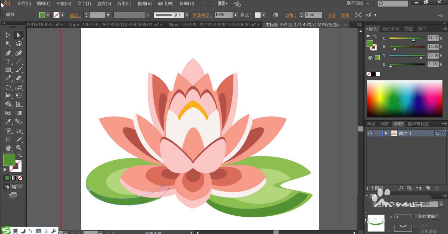 2、使用明暗绿色分别填充红莲的大叶片,外边缘用深绿色,内部用浅绿色,高光用绿灰色。