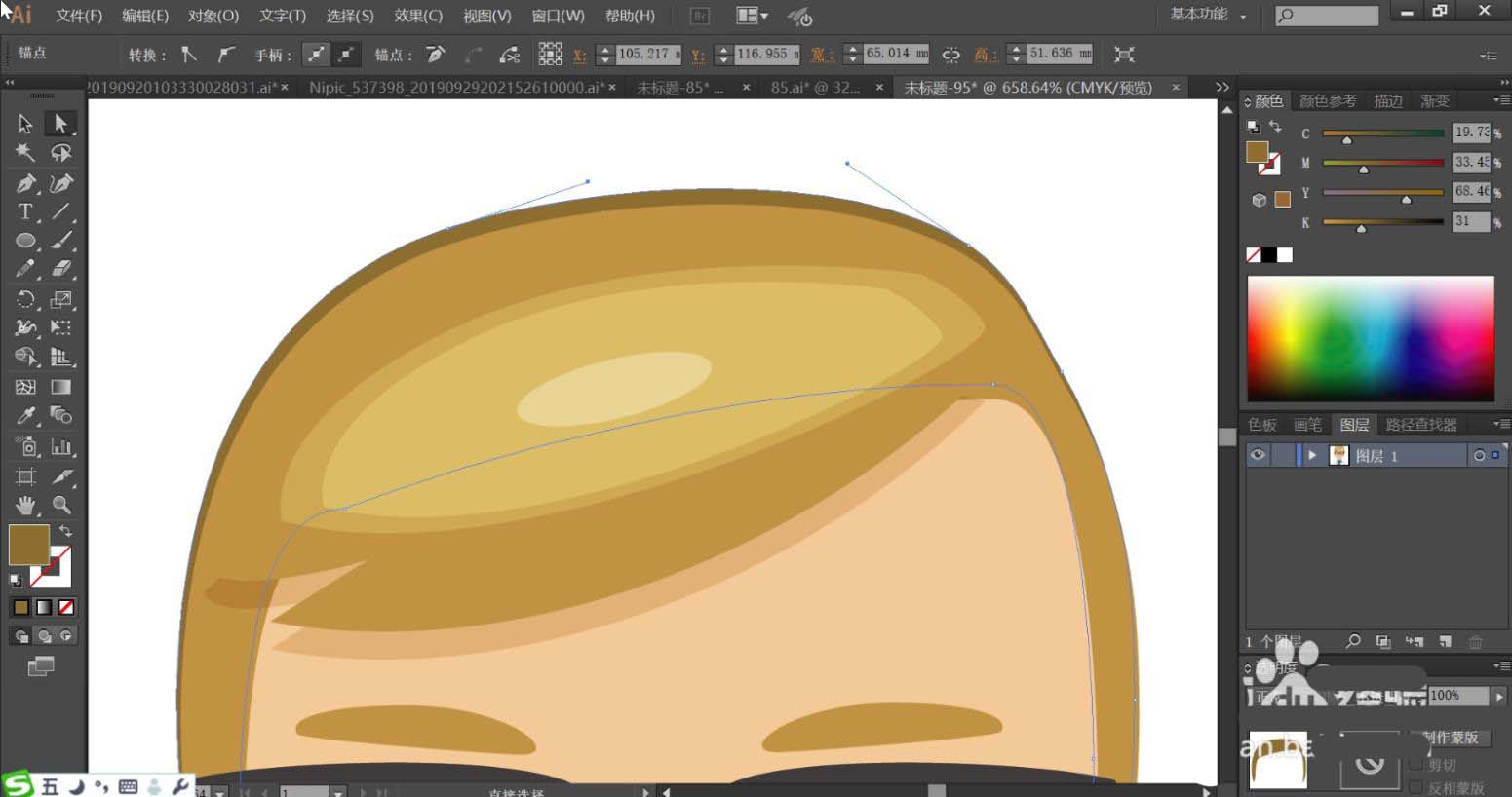 2、使用黄褐色填充男生的头发,再用滤色模式的黄褐色填充头发的高光路径,设置高光为半透明的效果,头发的边缘使用暗黄褐色填充。头发的高光使用半透明的白色填充并放置在头发的中间位置。