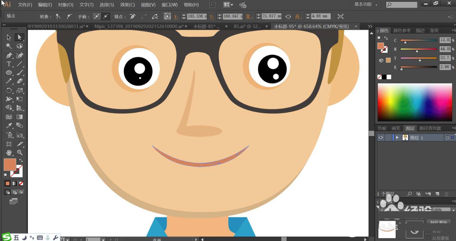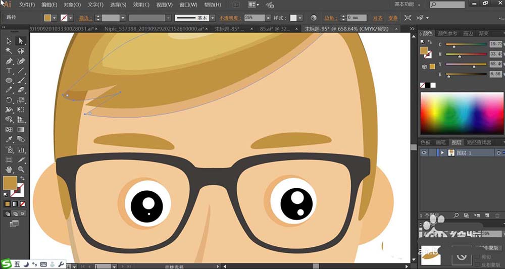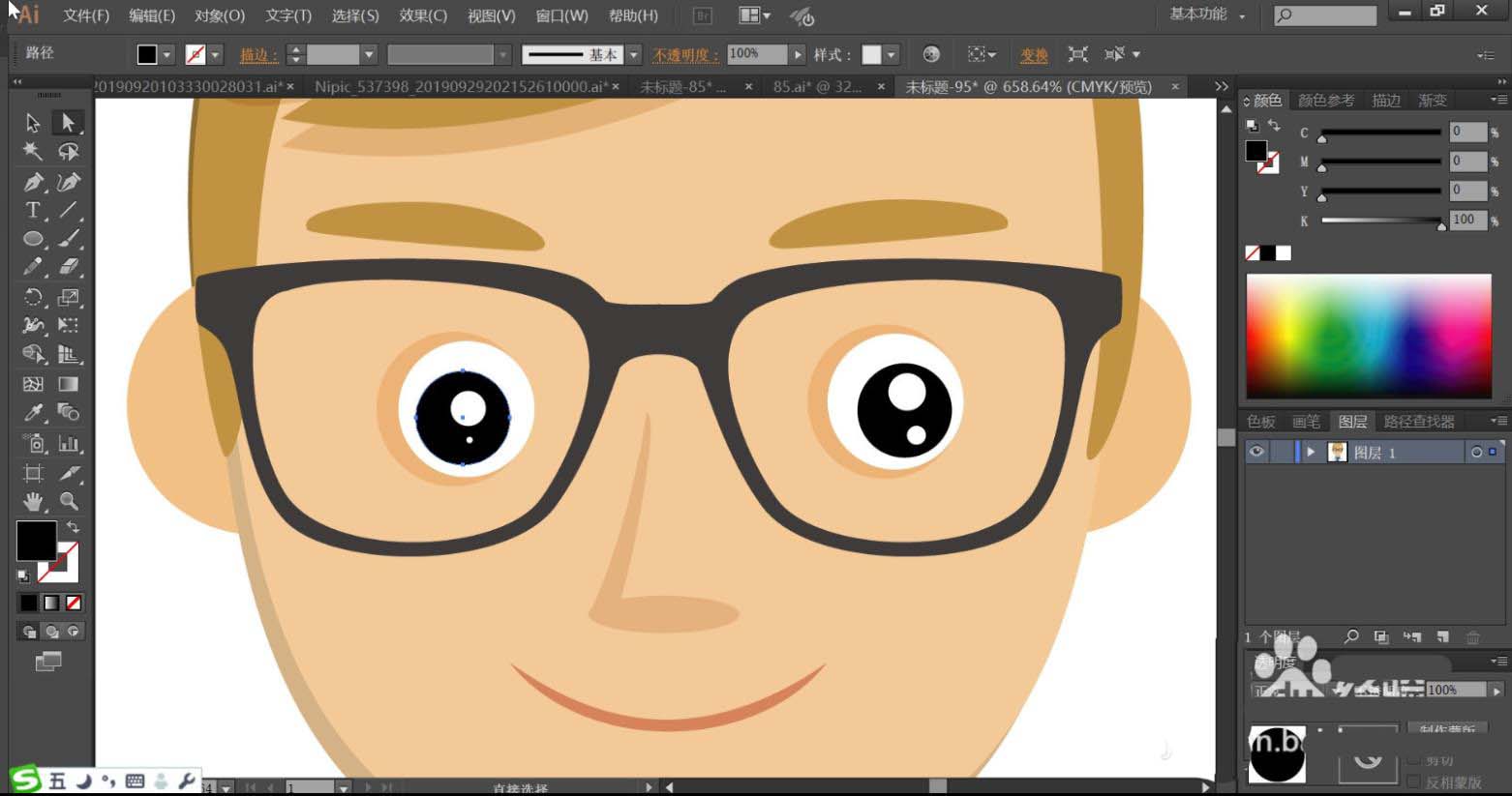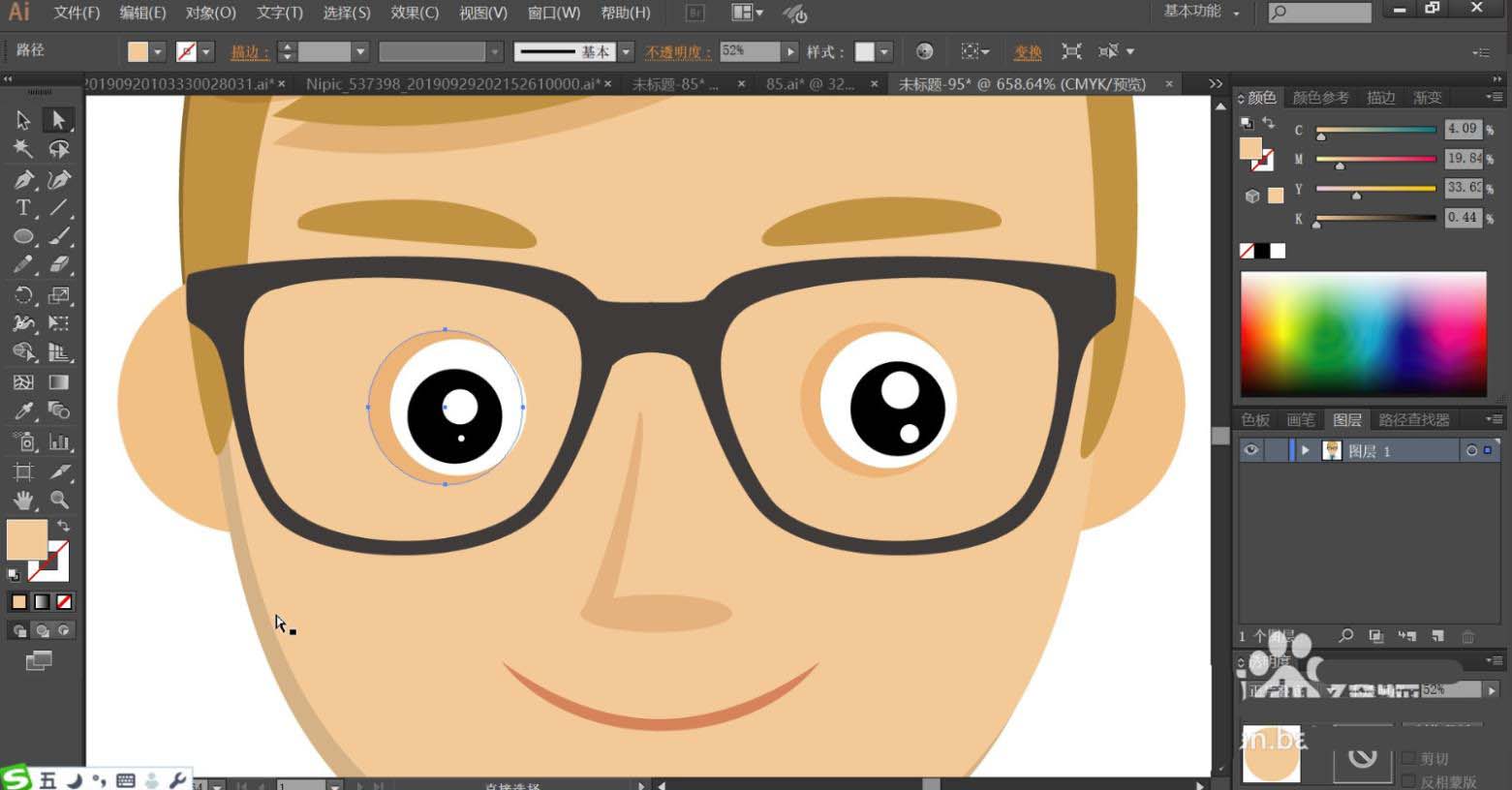4、男生的眼镜使用黑色填充,眉毛使用黄褐色填充,眼晴的内部使用白色填充眼白,瞳孔用黑色,亮点用白色。