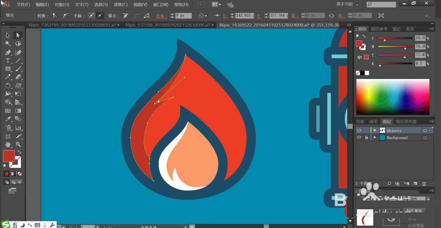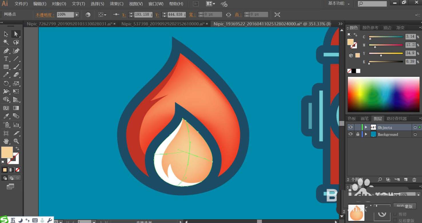 4、使用网格工具点击一下火苗的红色区域与红灰色区域让其呈现渐变色的效果,完成火苗的绘制。