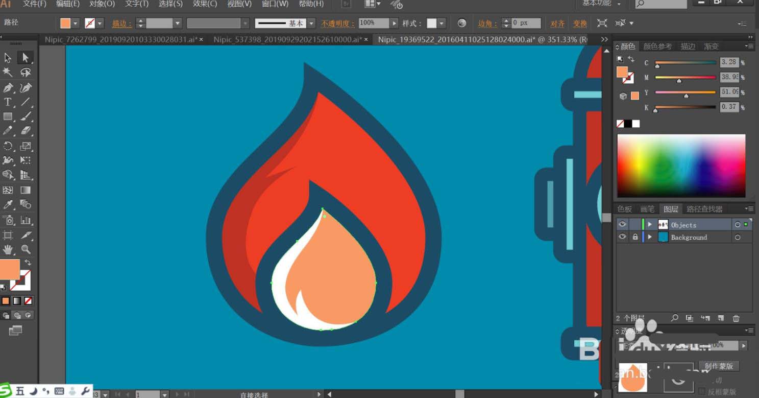 3、火苗的内部用红灰色与白色填充,内部的火苗路径可以直接复制外部火苗并缩小。