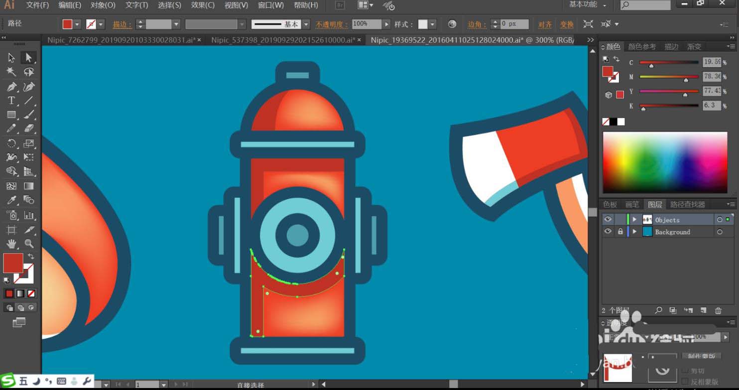 1、使用钢笔画出火苗的内外结构,重点绘制火苗的左侧暗光路径。接着,画出消防栓的细节路径,最后画出消防斧的金属结构与手柄的细节。