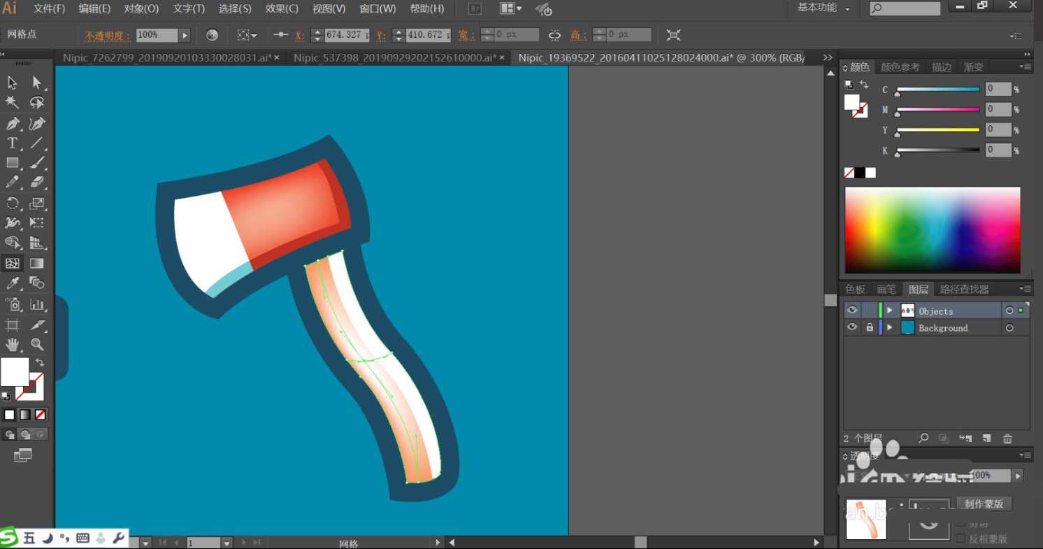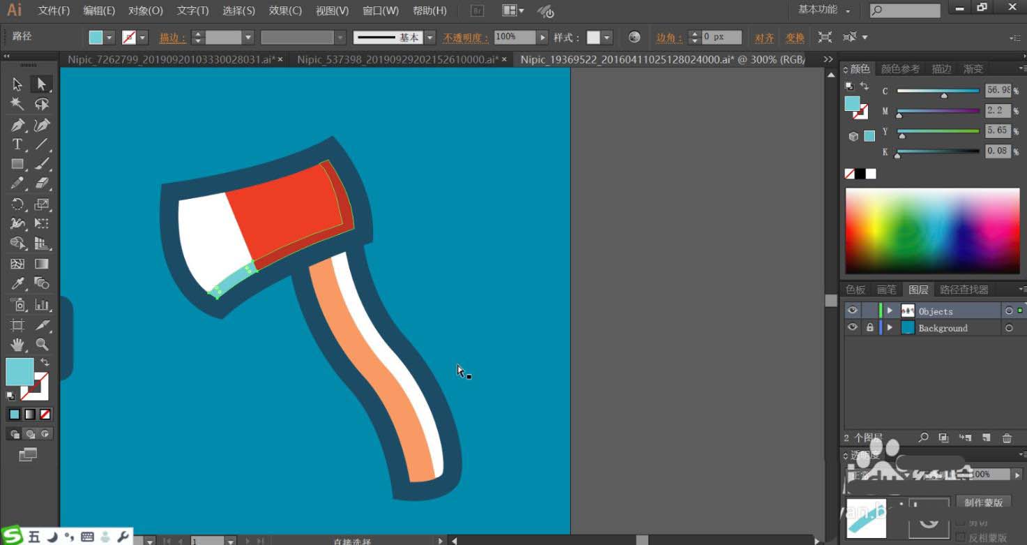 7、最后,我们用红色、白色填充斧头的路径,再用纯蓝色与暗红色填充斧头的下边缘暗光,使用蓝黑色填充斧头的边缘,使用红灰色与白色搭配填充斧头的手柄路径,再用网格工具绘制出渐变色效果在斧头与手柄上面,完成消防素材设计。