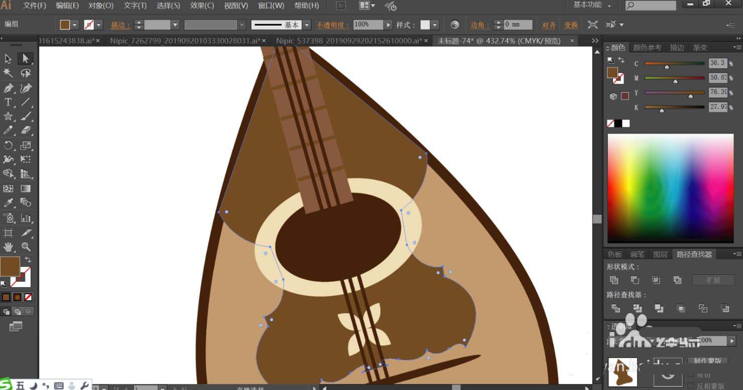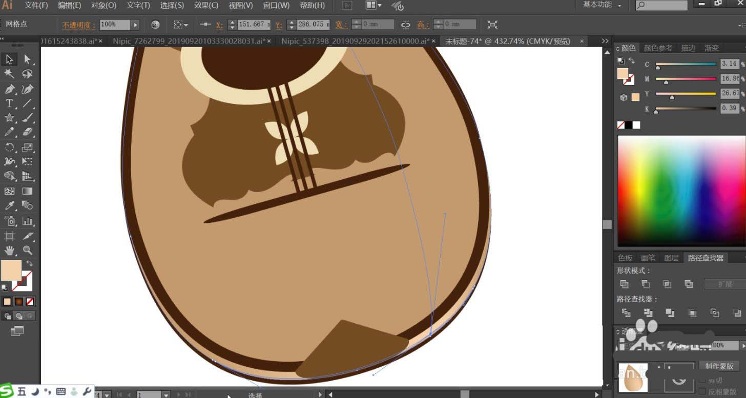 1、使用钢笔画出弹拨乐器的顶端琴弦结构件,再画出下方的手柄细节路径,继续画出圆形的木箱表面结构件与色彩明暗路径。最后,使用直线工具画出琴弦的细节路径。