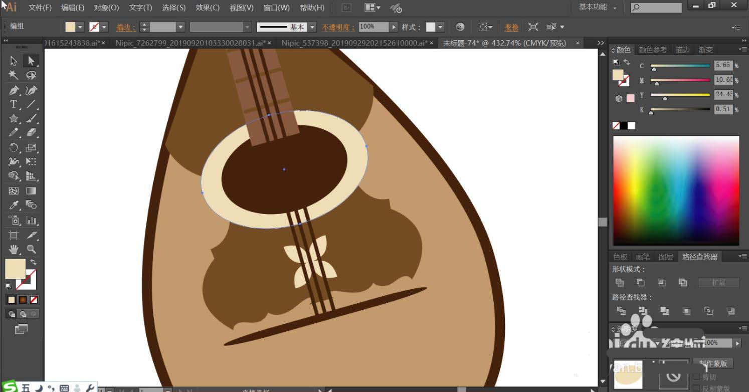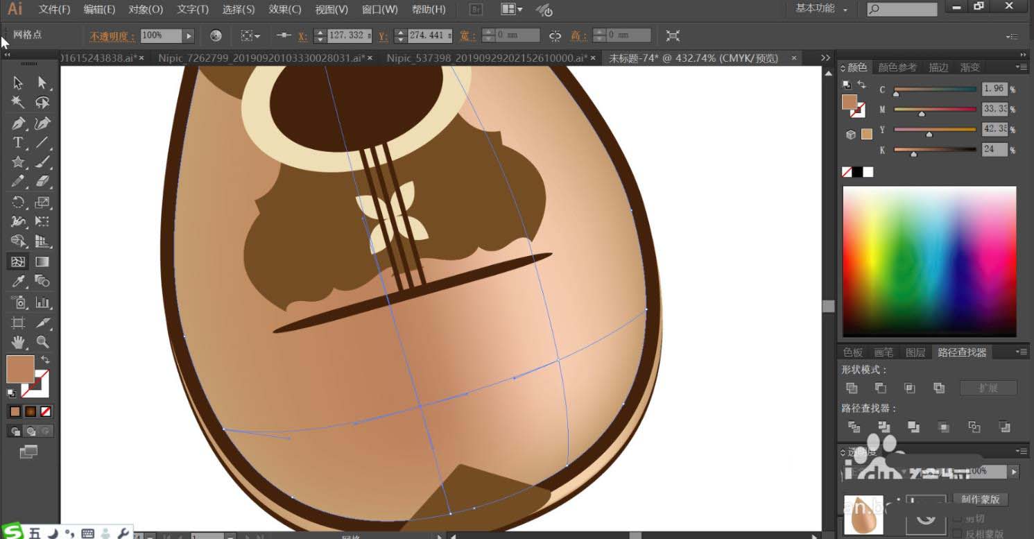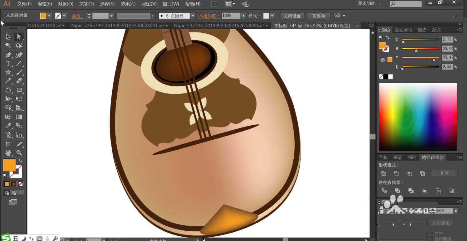 7、最后,我们使用网格工具点击木箱孔洞让其呈现咖啡色渐变的效果,孔洞周围画出黑色的边缘阴影,再用网格工具点击一下弹拨乐器的底部让其呈现黄绿色到橙色的渐变效果,完成弹拨乐器设计。