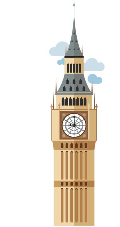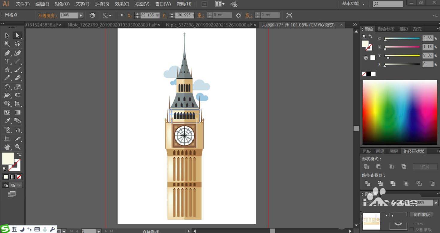 1、使用钢笔画出大钟楼的尖塔顶部与周围的云朵,再绘制出大钟楼中间的表盘元素,继续绘制出大钟楼矩形双层结构的细节,使用矩形工具绘制出大钟楼正面的圆角矩形孔洞路径。