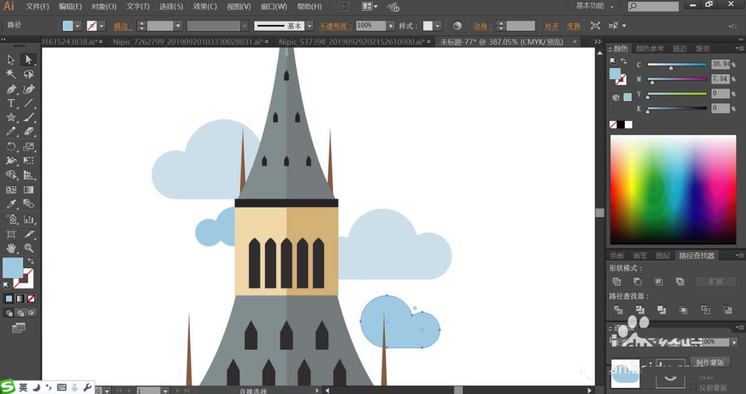 3、使用纯蓝色与天蓝色搭配填充大钟楼背后的大小云朵,让云朵有着远近深浅的效果。