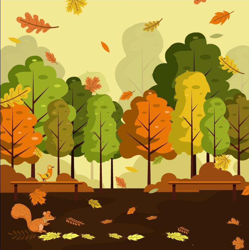 7、最后,我们再画出长椅上面的小鸟,使用桔红色与黄色填充身体与翅膀,腿部使用红棕色填充。松鼠使用桔红色与红灰色填充身体与右侧肚皮,项圈使用桔红色与黄灰色搭配填充,尾巴的下边缘做出暗光效果,完成公园秋天场景画设计。