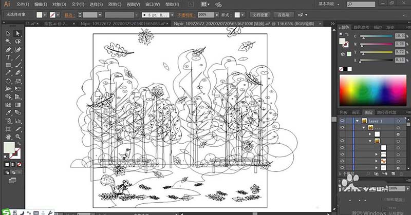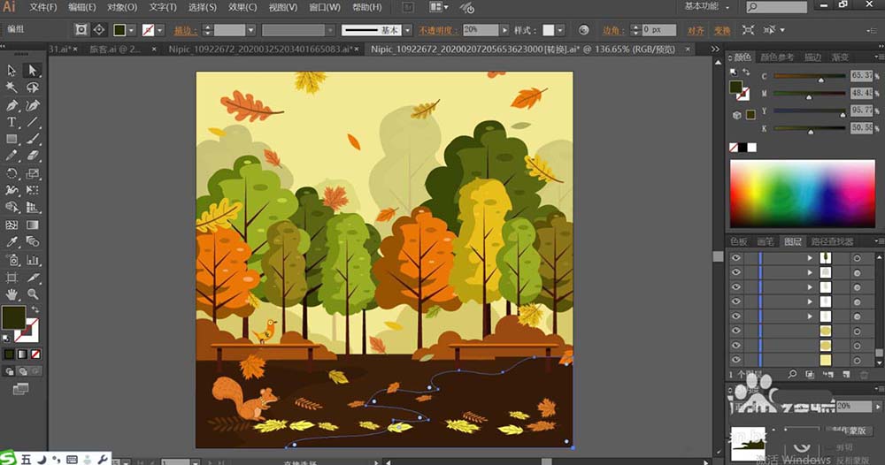 1、使用钢笔画出公园的天空、落叶、地面与树林,还有松鼠与长椅等多种元素的路径,再绘制出风景当中的近景与远景的元素。