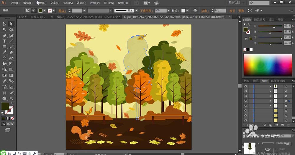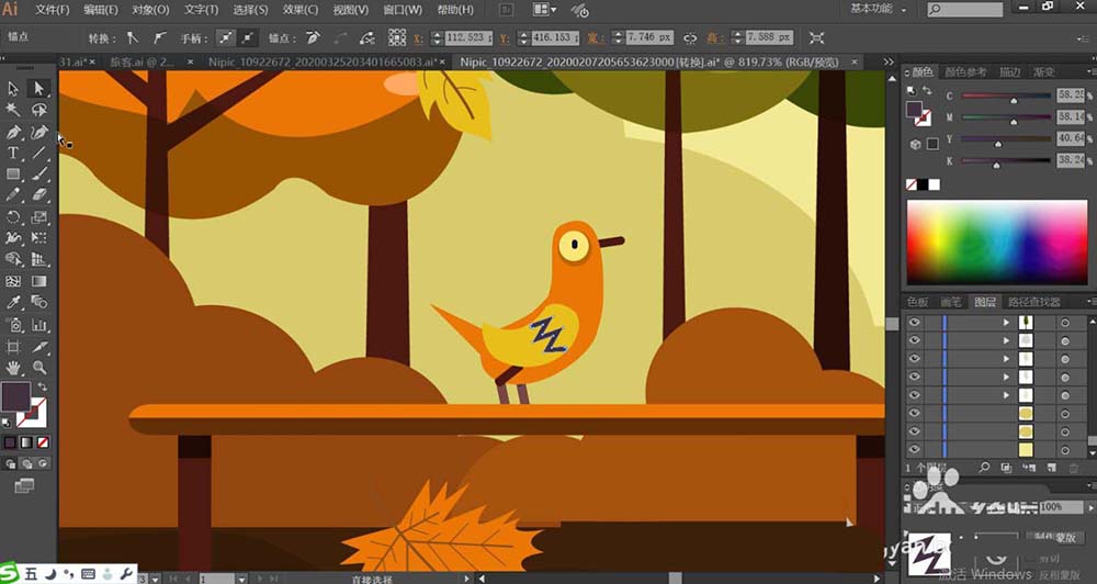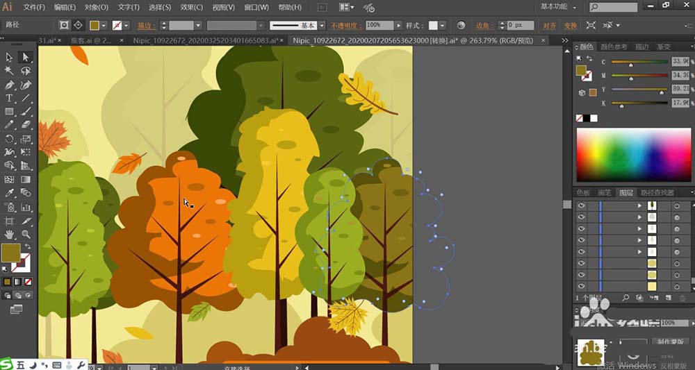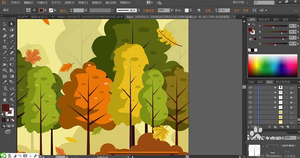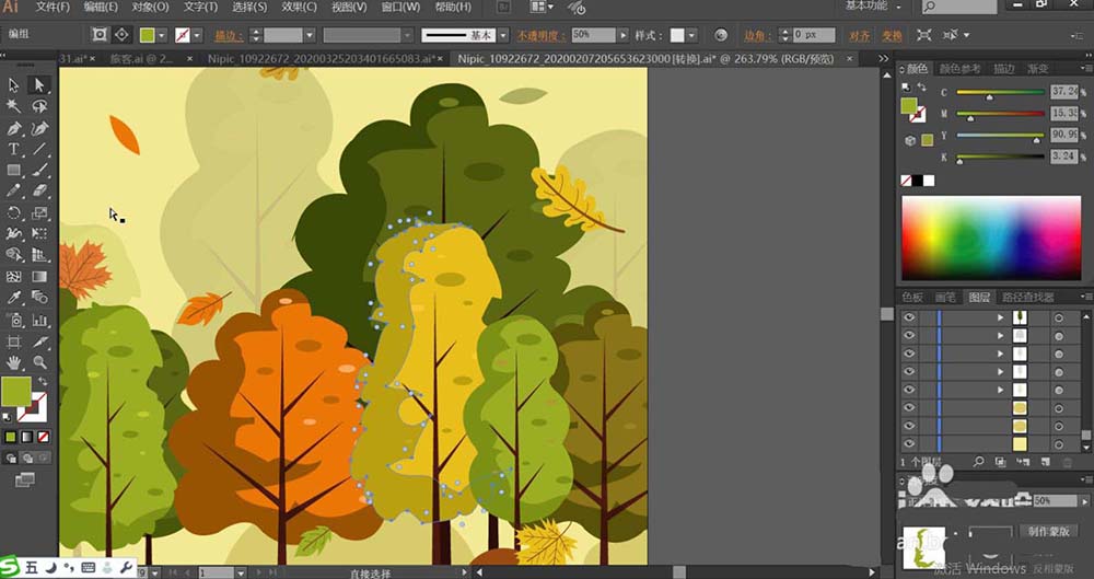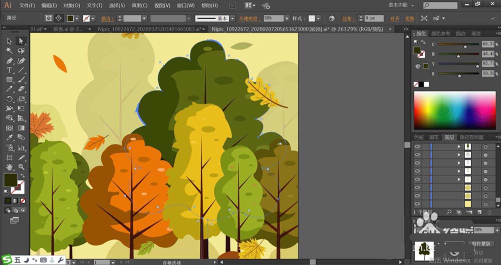 5、接着,我们使用暗绿色、桔红色、黄绿色分别填充不同的树木,再用正片叠底的绿色填充树木的左侧暗光区域,设置透明度在50%左右。让树木的左侧为暗光,右侧使用暗光效果的小叶片作为点缀。