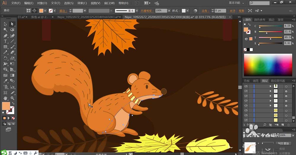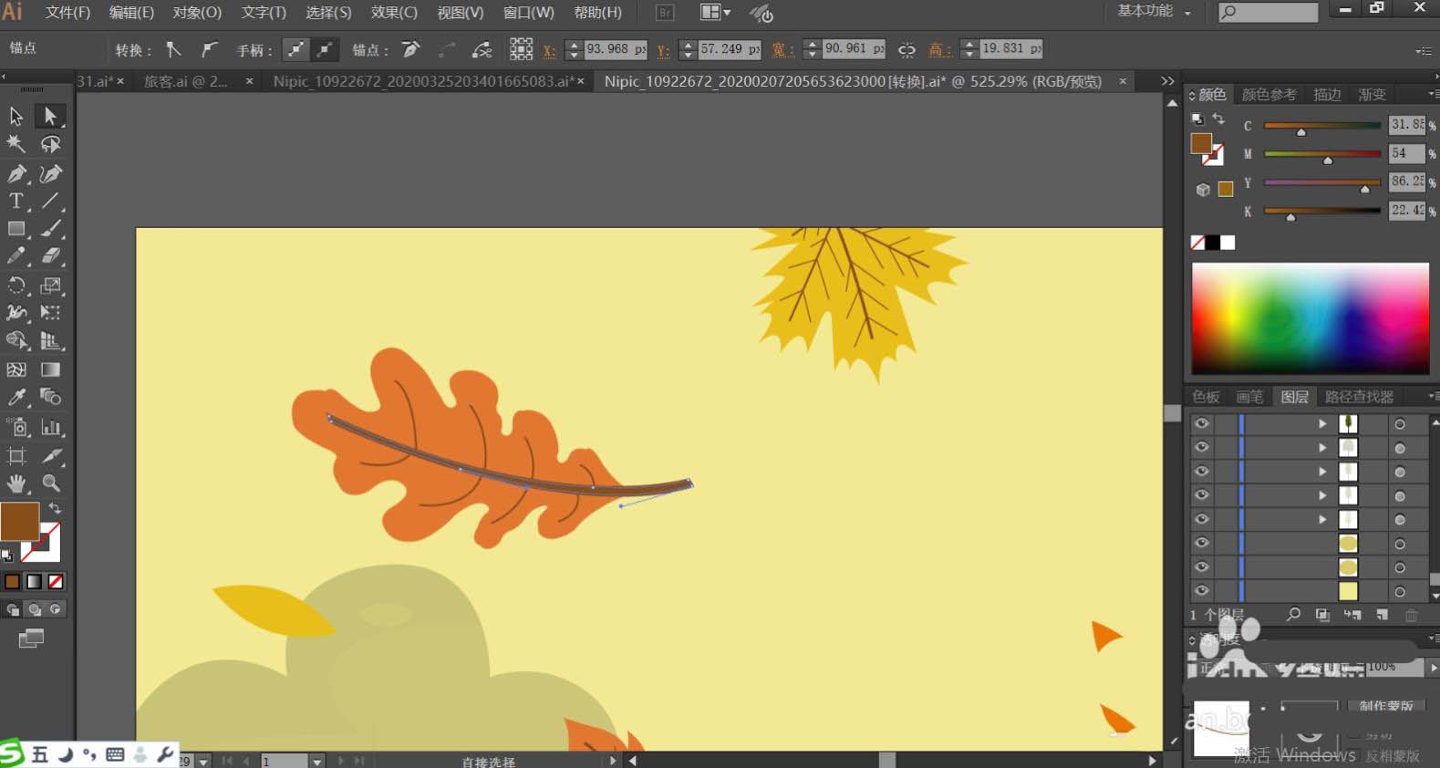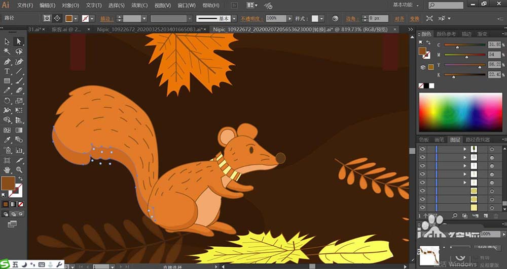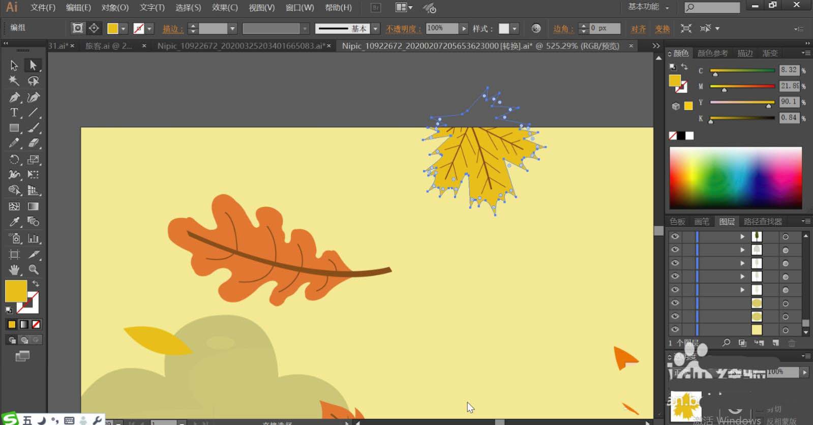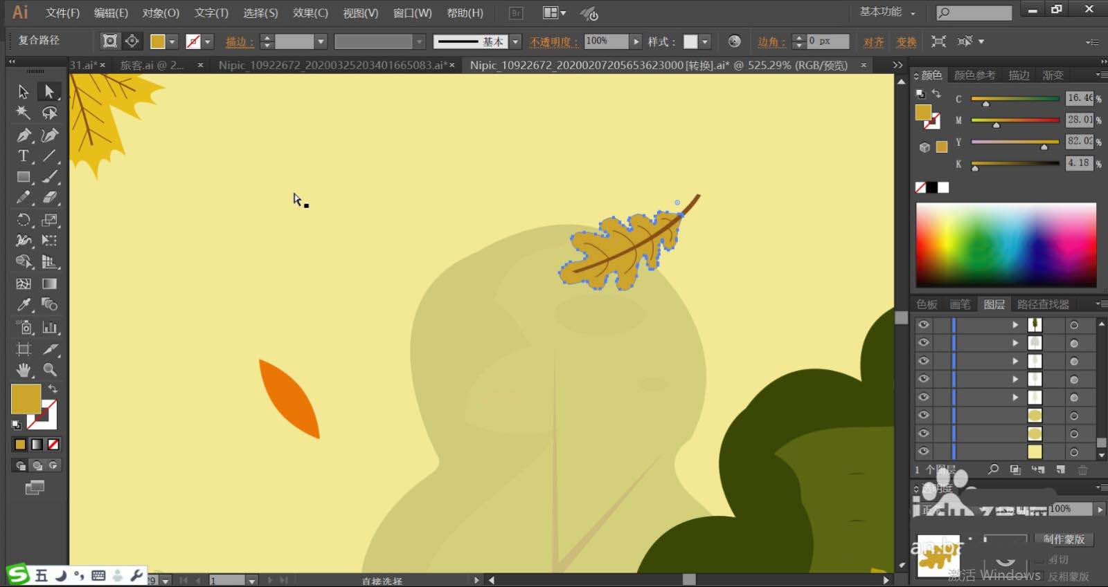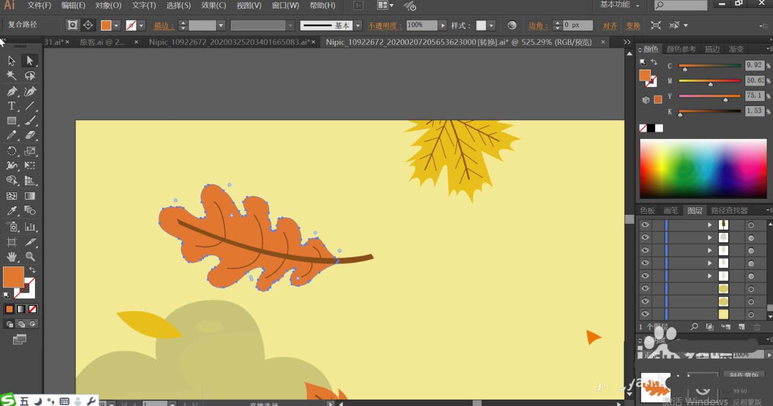 4、使用桔红色填充落叶的主体,再用红褐色填充叶片内部的茎杆的路径。黄色的落叶使用暗黄色填充落叶的主体。其它的落叶使用黄绿色填充叶片的主体,让落叶在形状与色彩上区别开来。
