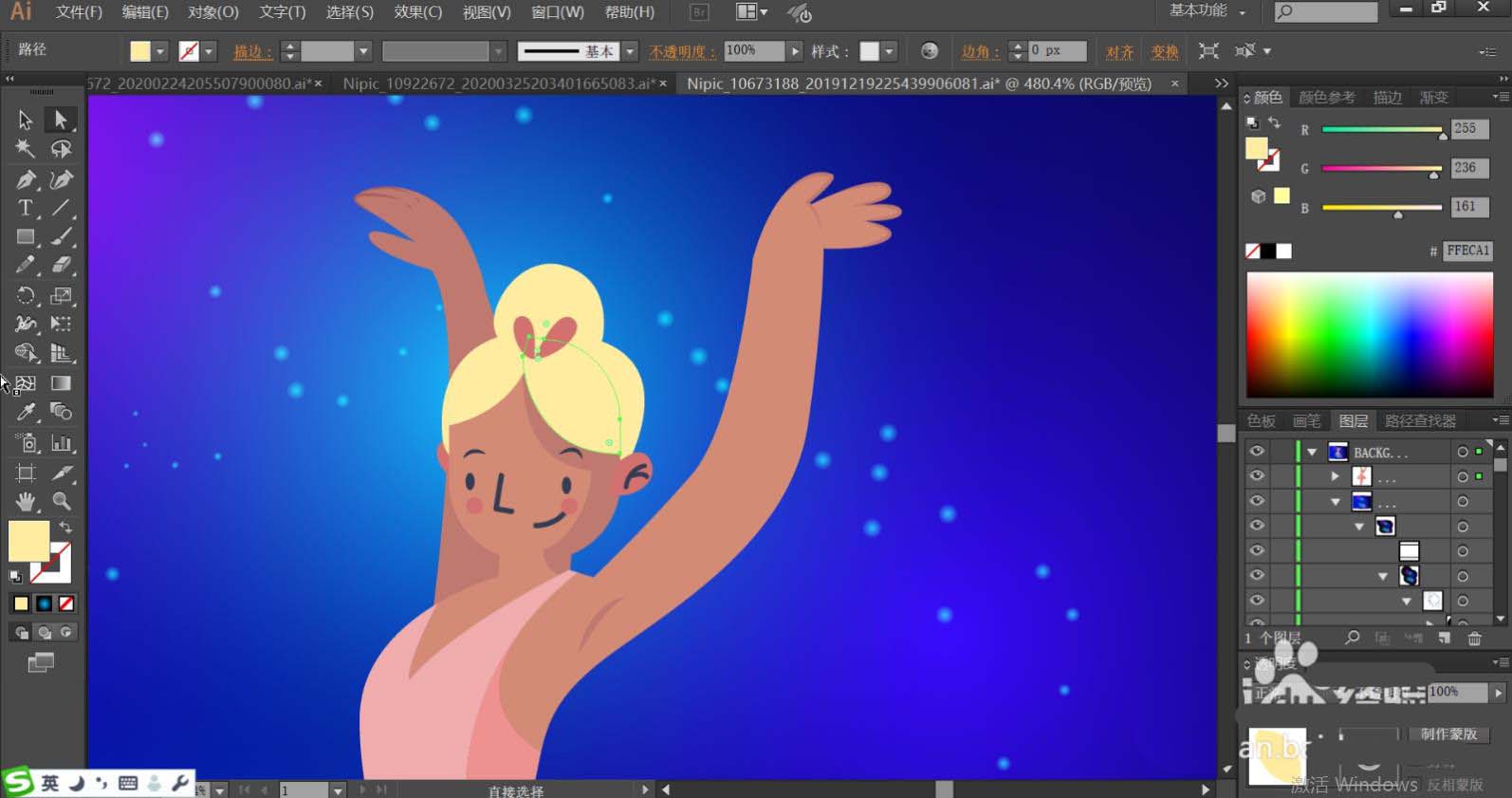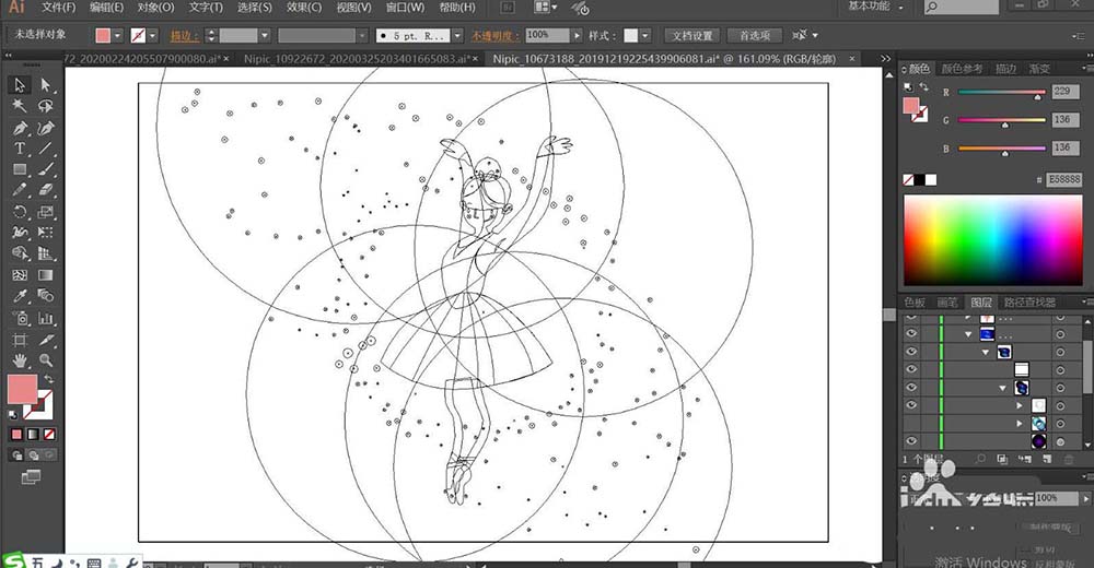 1、使用钢笔画出人物举手双手跳舞的动作,再画出她的服饰细节,接着,我们画出背景上面的所有的光圈细节路径,再画出圆点的细节路径。