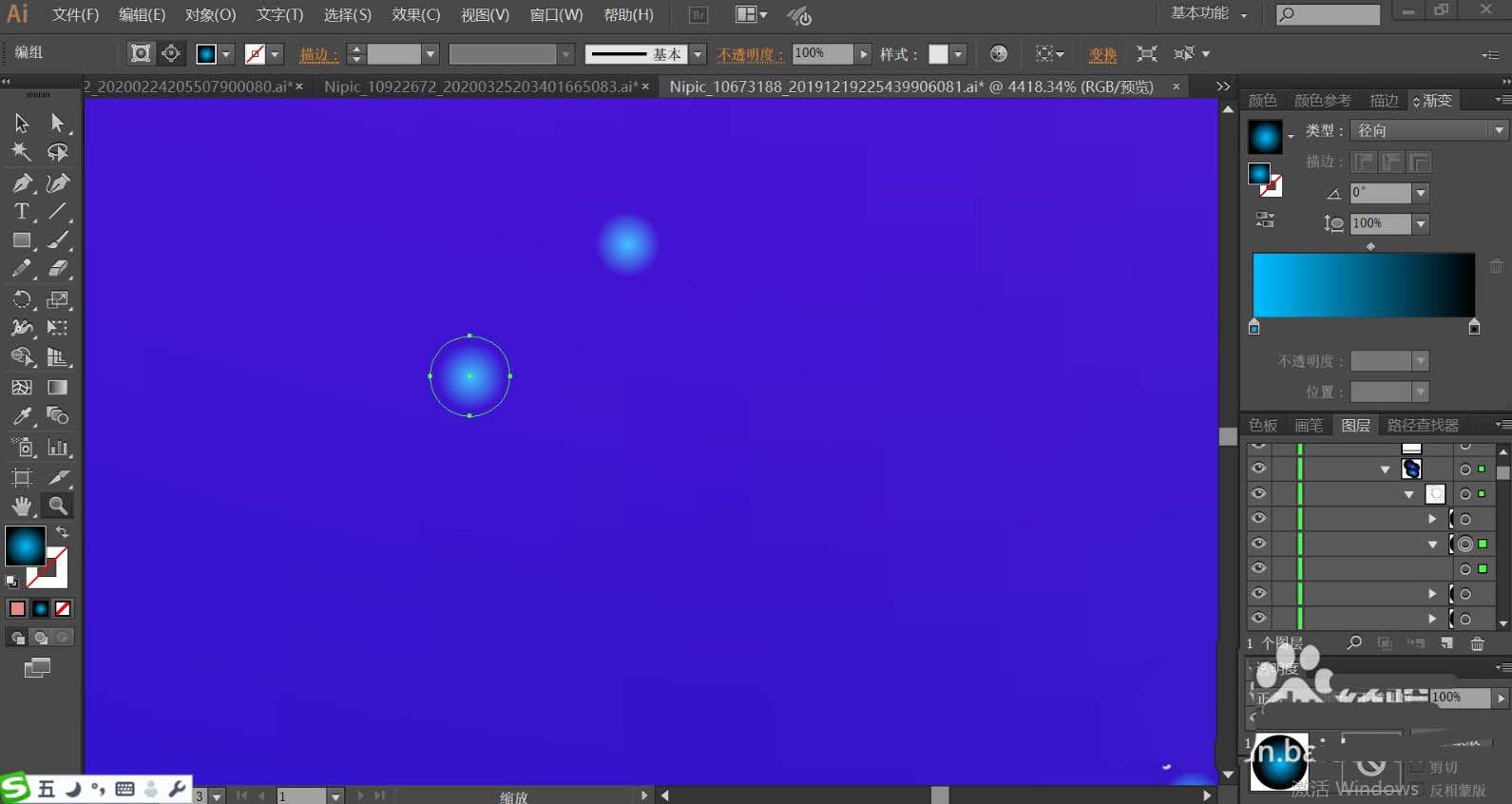 4、使用蓝色的径向渐变填充小的圆点,复制圆点在舞者的身体周围,让其成为光斑的效果。