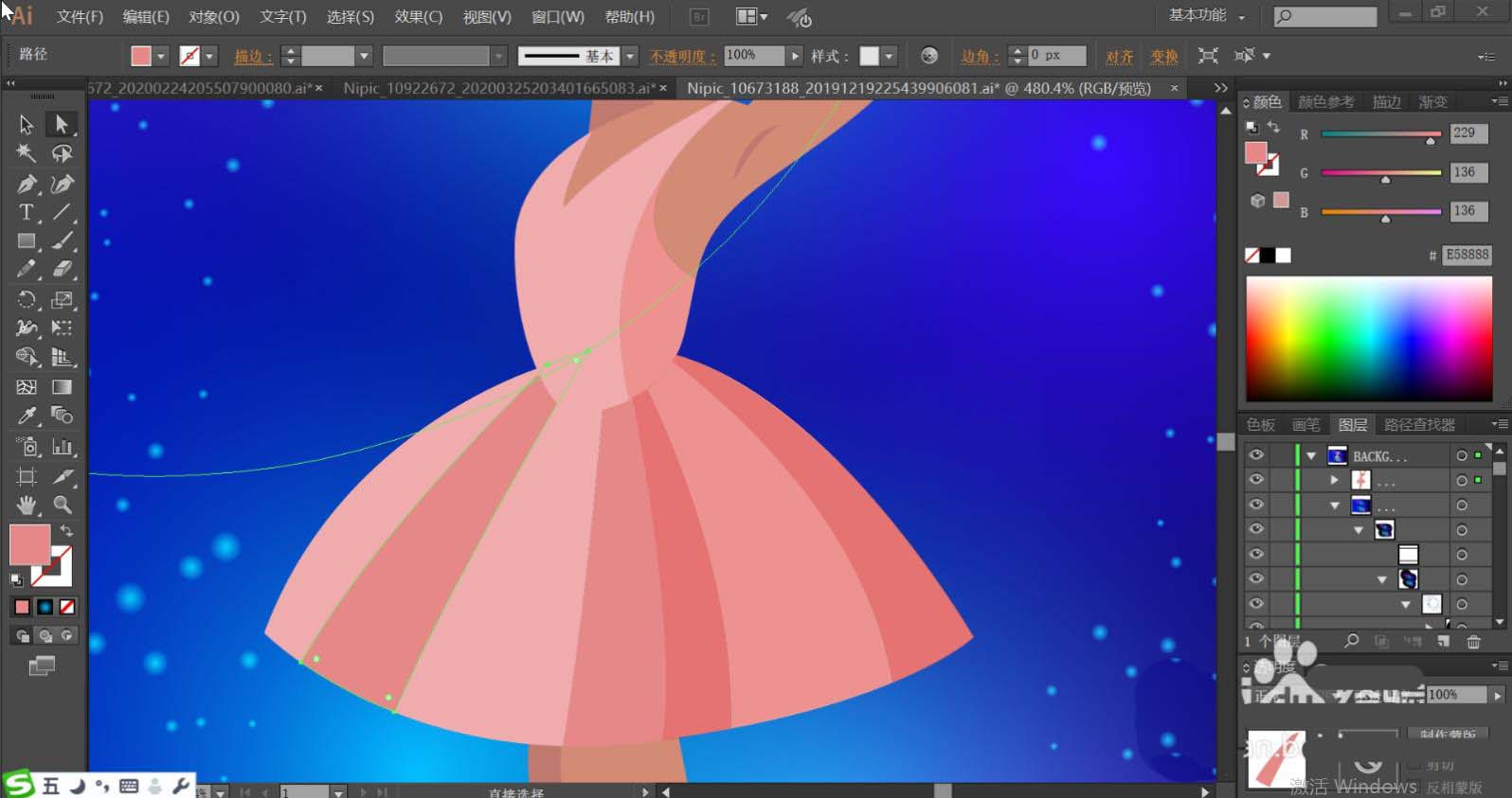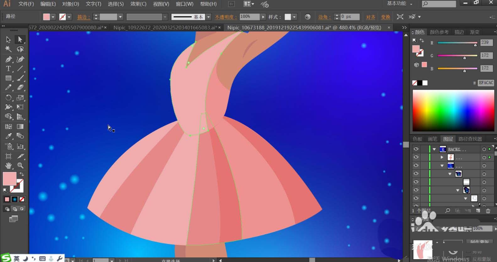 6、使用粉红、桃红、海棠红等多个相似色去填充女子的裙子,让丰富的色彩效果呈现在裙子上面。