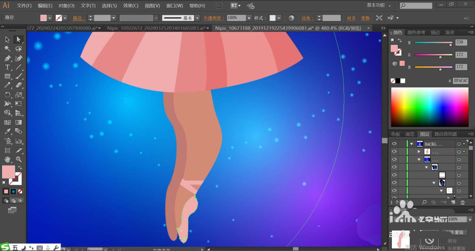 7、使用明暗两种嫣红色填充女子的双腿,再用粉红色填充女子的舞鞋,完成舞者梦想场景画设计。