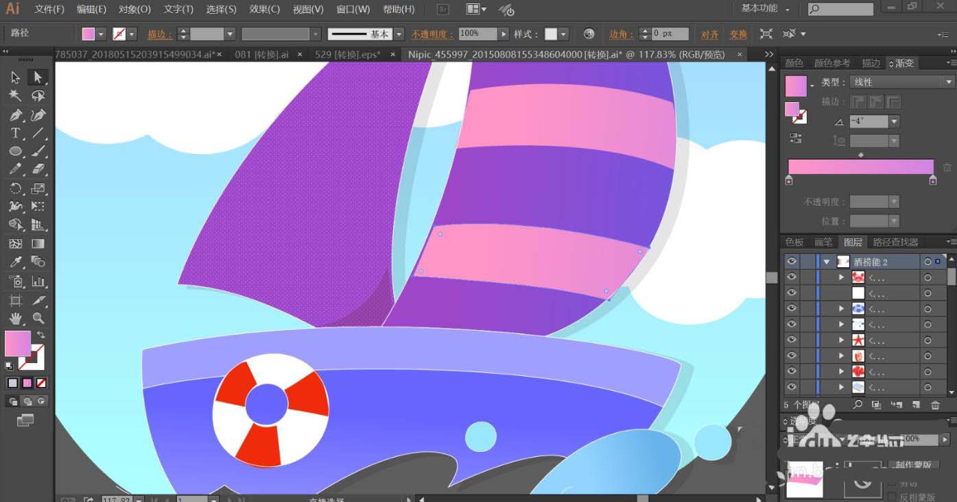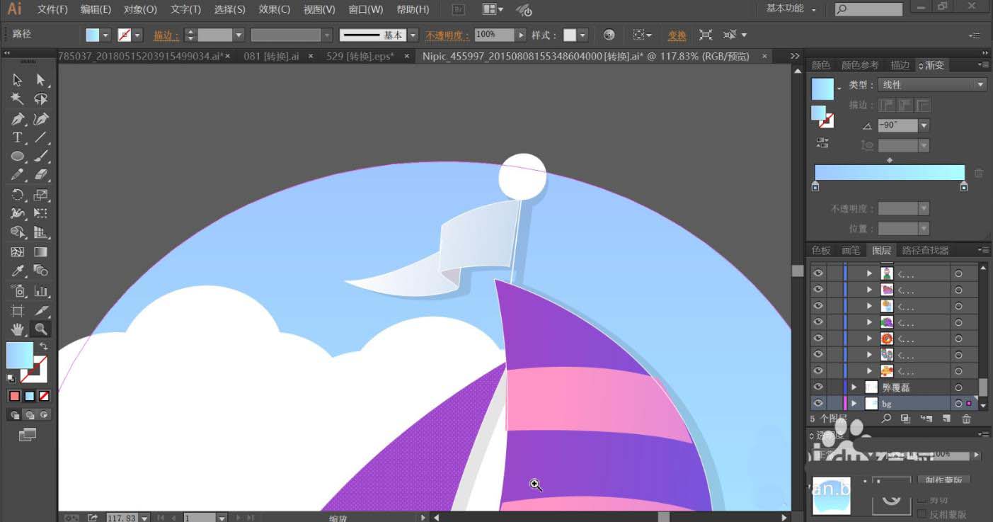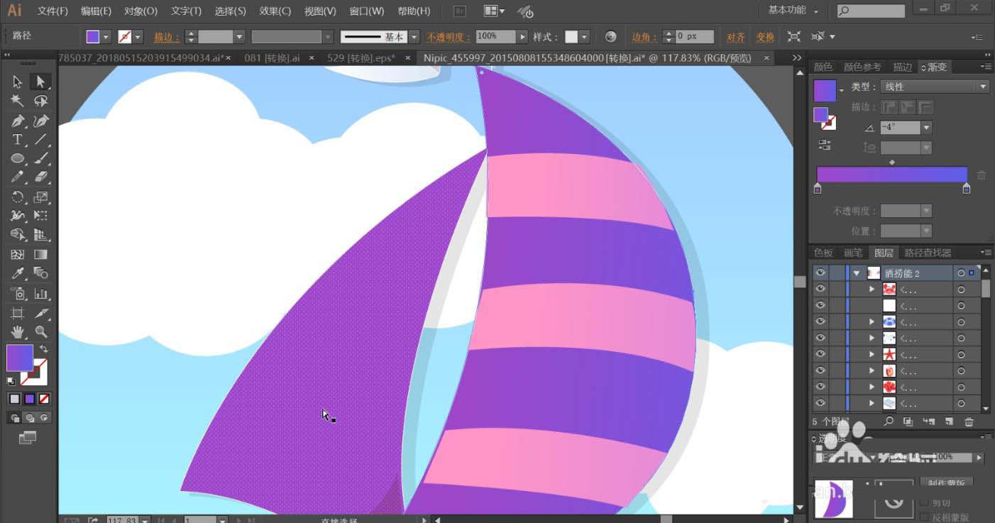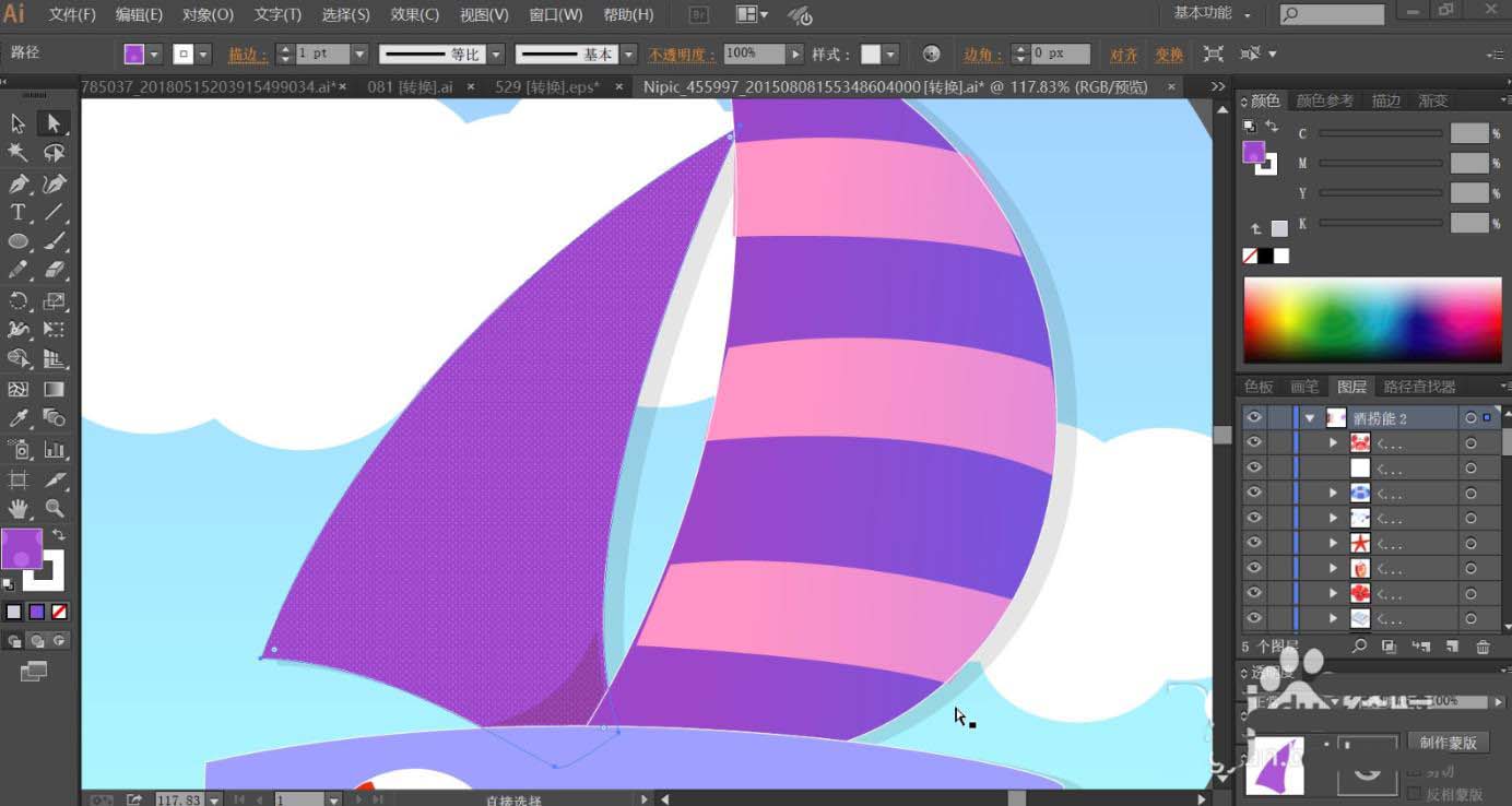 4、右侧风帆上面的条纹用粉红色的渐变填充,左侧的风帆用蓝紫色的圆点图案进行路径的填充,给风帆也画出阴影效果。