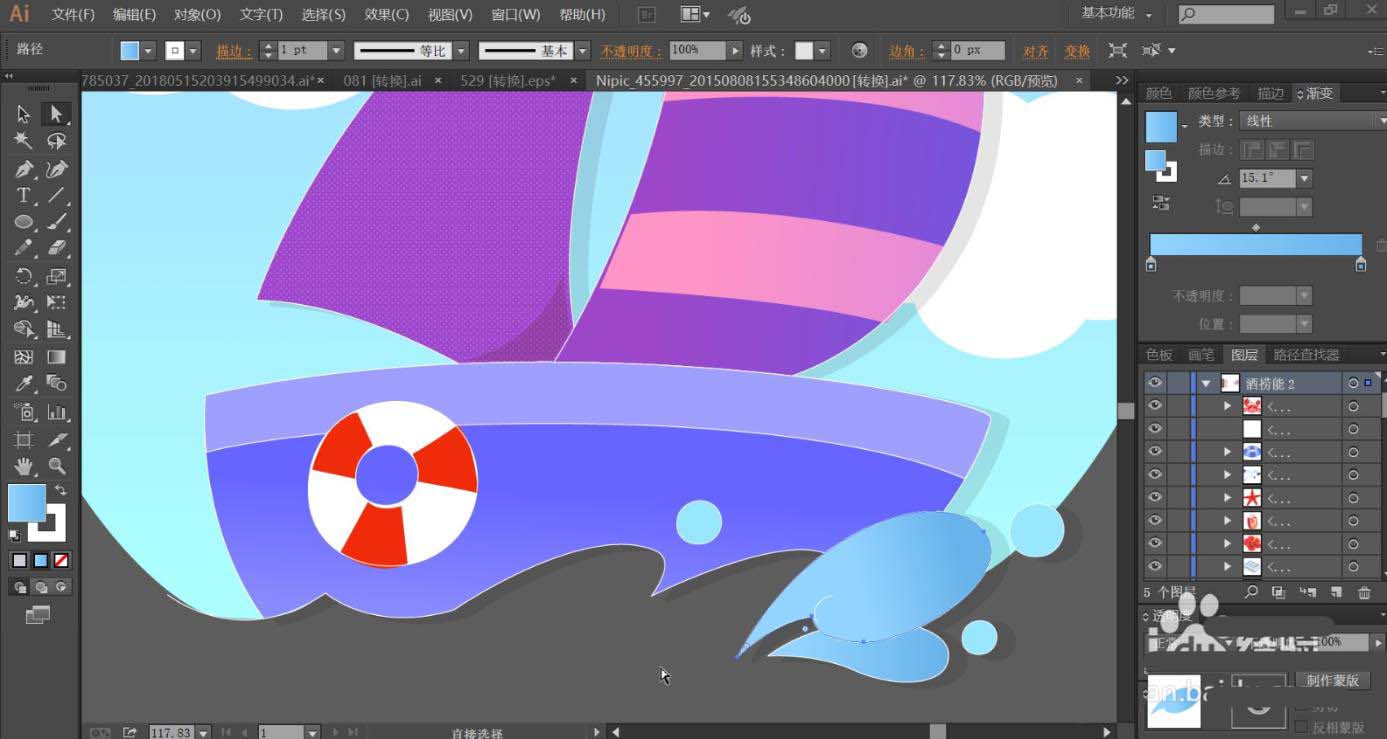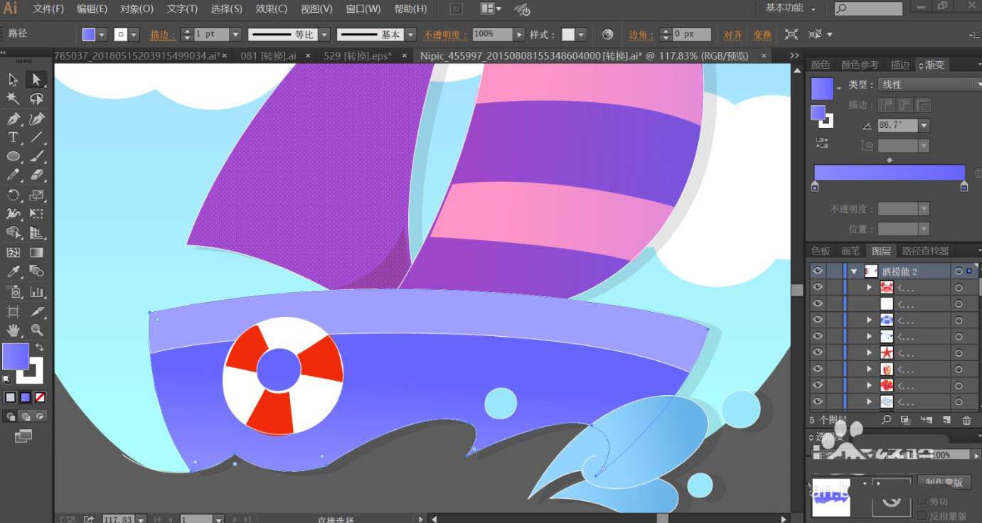 6、帆船的主体用蓝灰色与蓝色的渐变搭配填充船弦与船体两个部分的路径,救生圈用红白色搭配填充。
