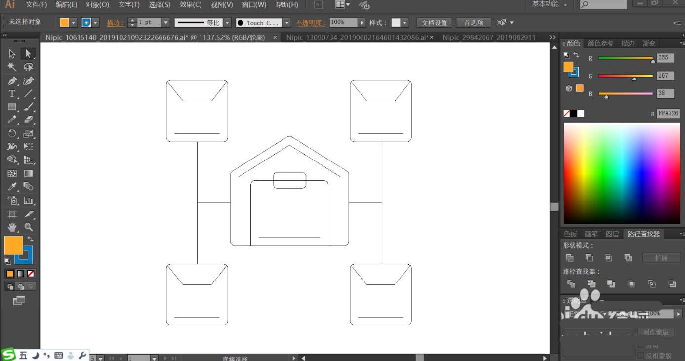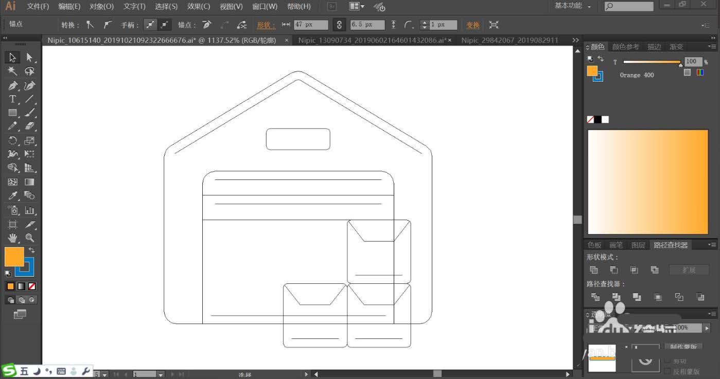 1、使用矩形画出仓库的主体路径,再用钢笔画出仓库的尖顶结构,接着,我们用钢笔画出货物的形状,再用钢笔描绘出细节元素。使用矩形画出仓库的正面大门路径。