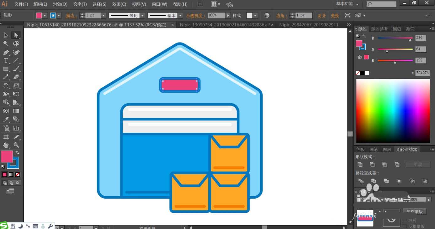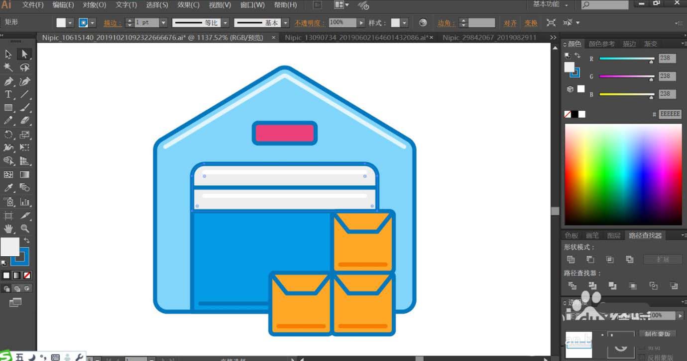 2、使用纯蓝色与暗蓝色搭配填充仓库的大门与外边缘的路径,再用深蓝色填充大门的内部路径。