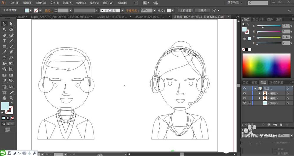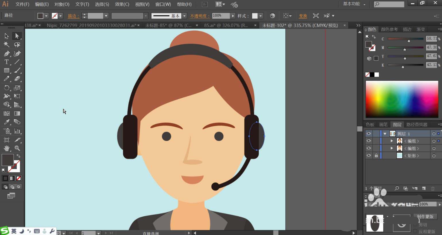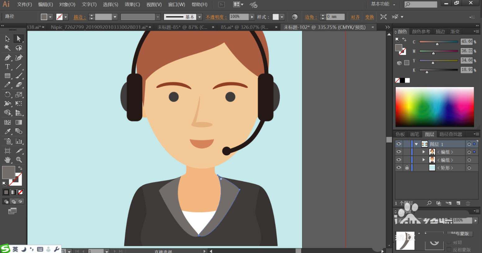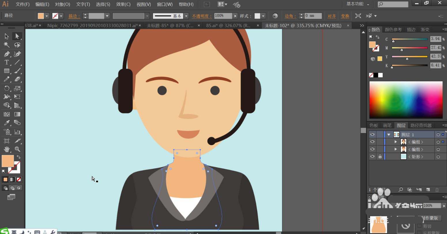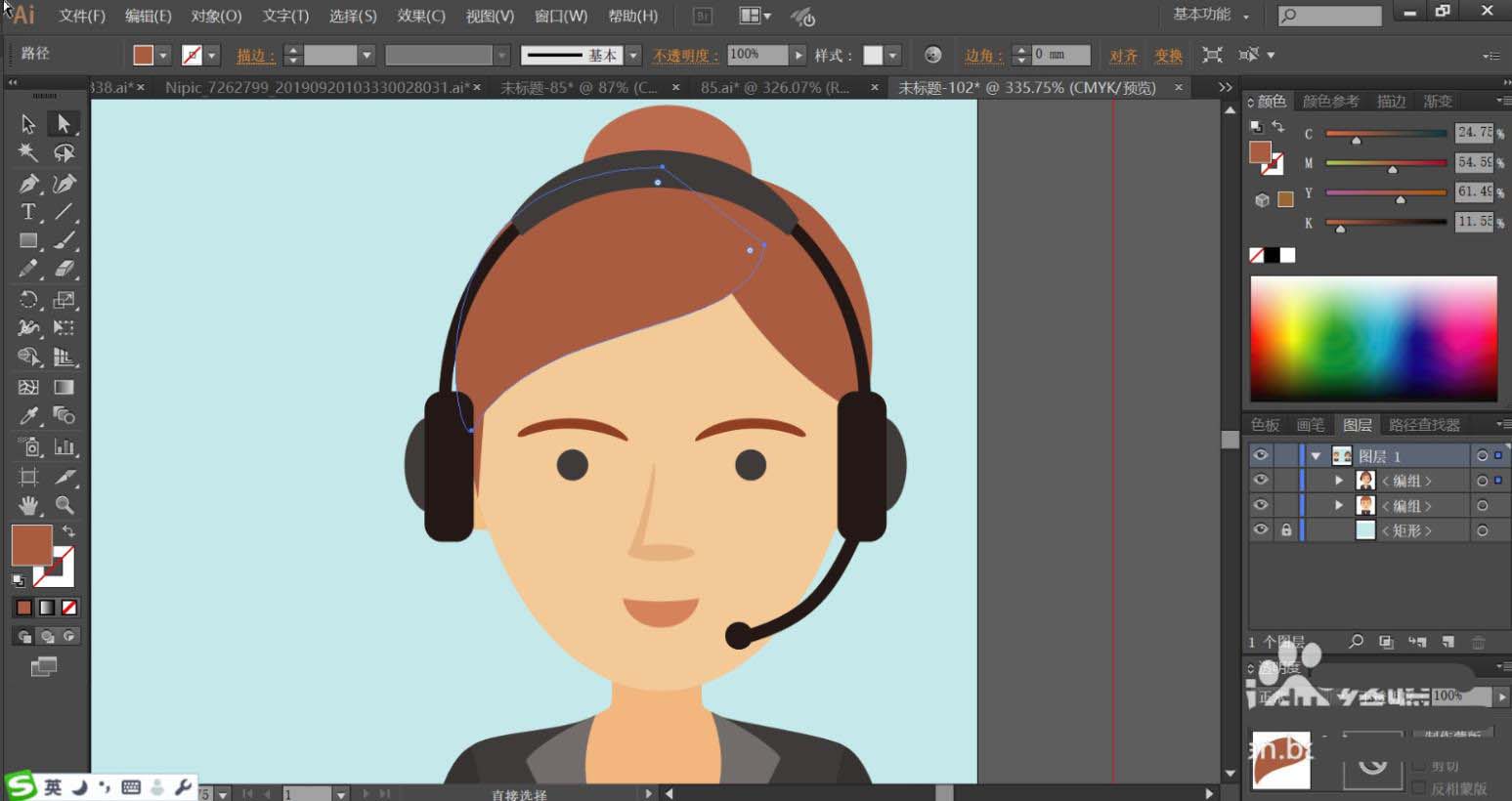 1、使用钢笔工具画出客服的基本轮廓,重点绘制客服的头发、表情、服饰的细节元素,最后,再绘制出客服的耳机等其它的元素的细节路径。