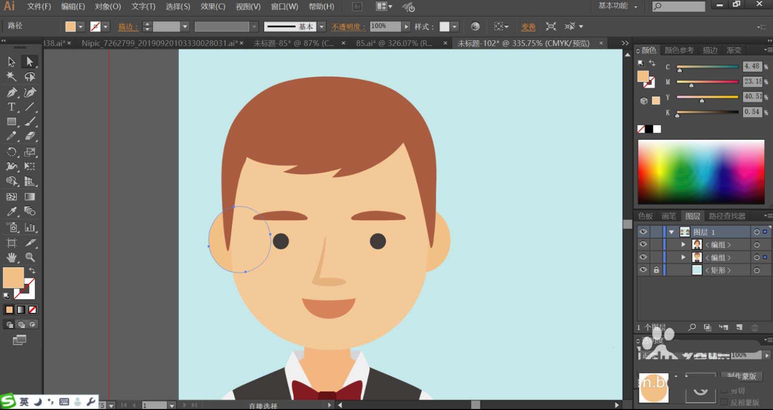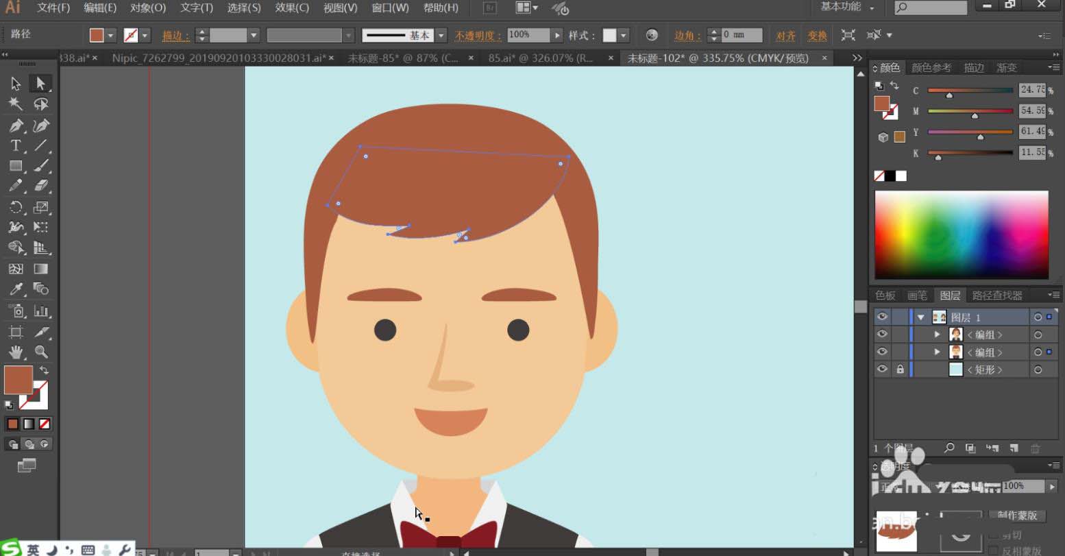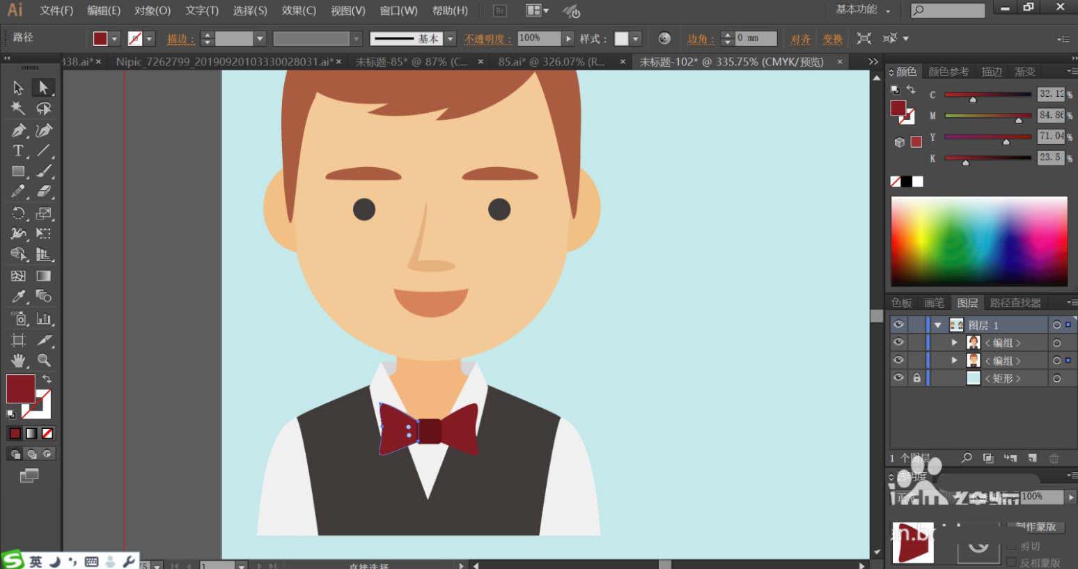 4、男生的服饰使用灰黑色填充马甲,再用灰白色填充衬衫的路径,脖子的色调比脸蛋稍暗一些。男生的领结使用明暗红棕色填充左右两侧与中间的凸起。