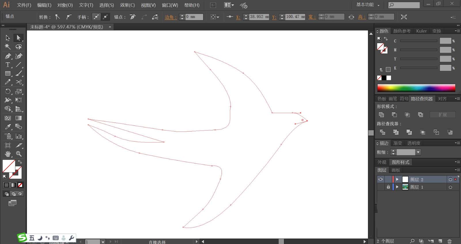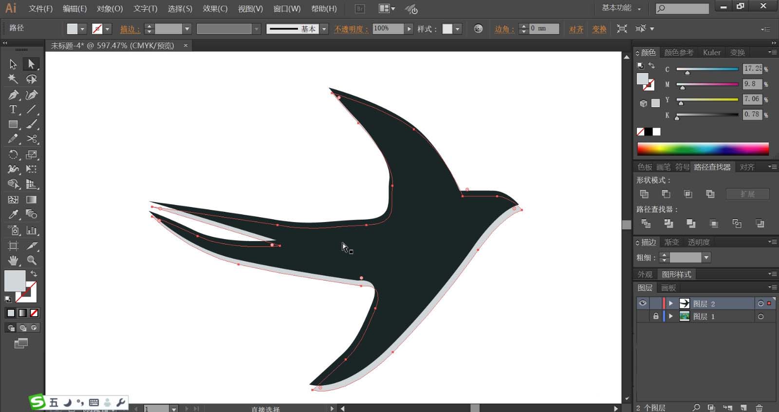 1、使用钢笔画出天空中的小鸟形状,在翅膀等弯曲路径处用锚点拉出自然的转折,复制这个小鸟的路径让其成为阴影的轮廓。